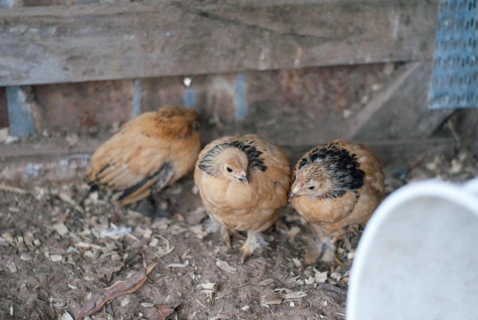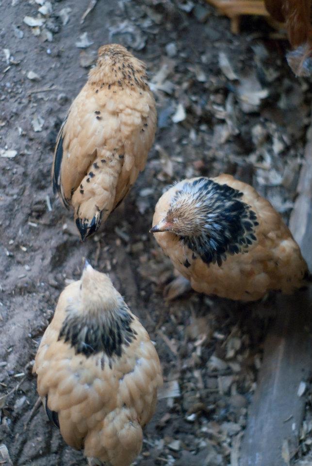 The two look to be buff Brahmas and the third appears to be a D'Uccle. The D'Uccle looks to be in between a buff colombian and a mille fleur in color. The coloration will change as it gets older so it may end up being a mille fleur.