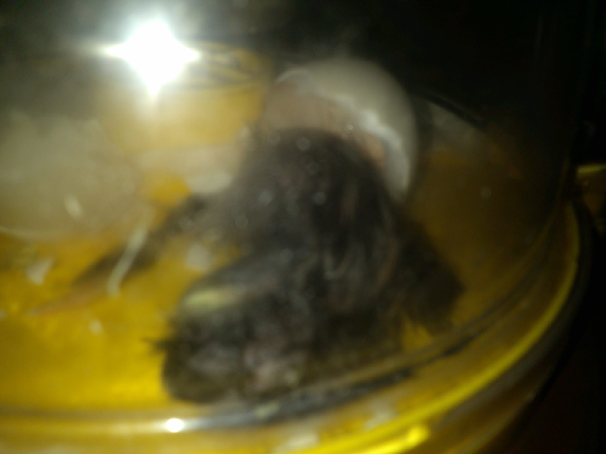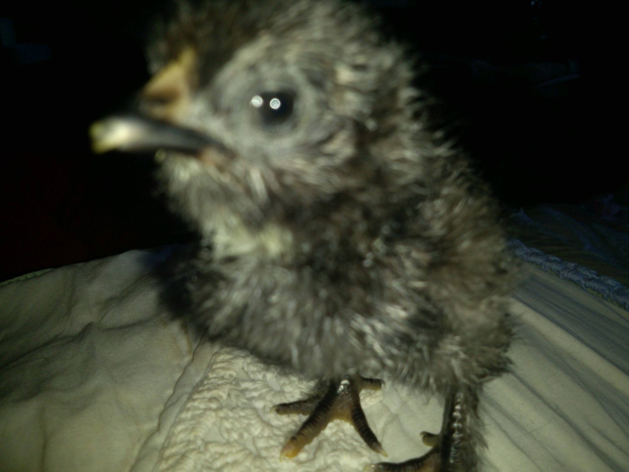 this girl is a week and a half this one hatched this last Monday I have another I haven't taken a picture of that came out looking like a golden sex link instead of a dark one she's a week old today I'll get a picture of the 3 later today... I have another due Sunday....the temp is cooler so my incubators cooled...she may be late