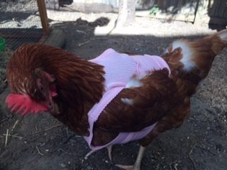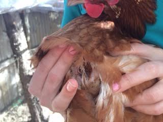 Today I discovered my beautiful hen has a bald patch and dark red wound (it is not open, seems to be like a scab) under her left breast. It took me a while to find out because it was so well hidden. I feel that it started off small, but was made far worse by her constant scratching (with her left foot) and pecking.