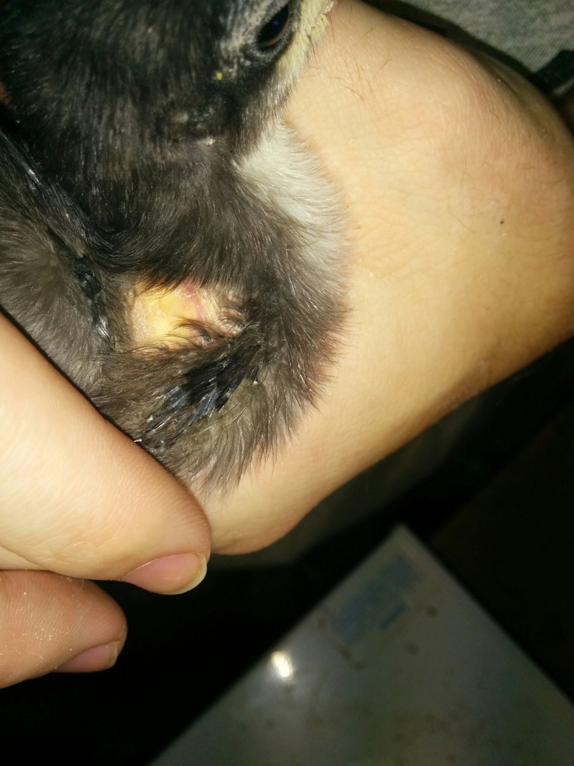 I got this one with a bunch of others as day old peeps. It came to us with this bare patch of skin:
