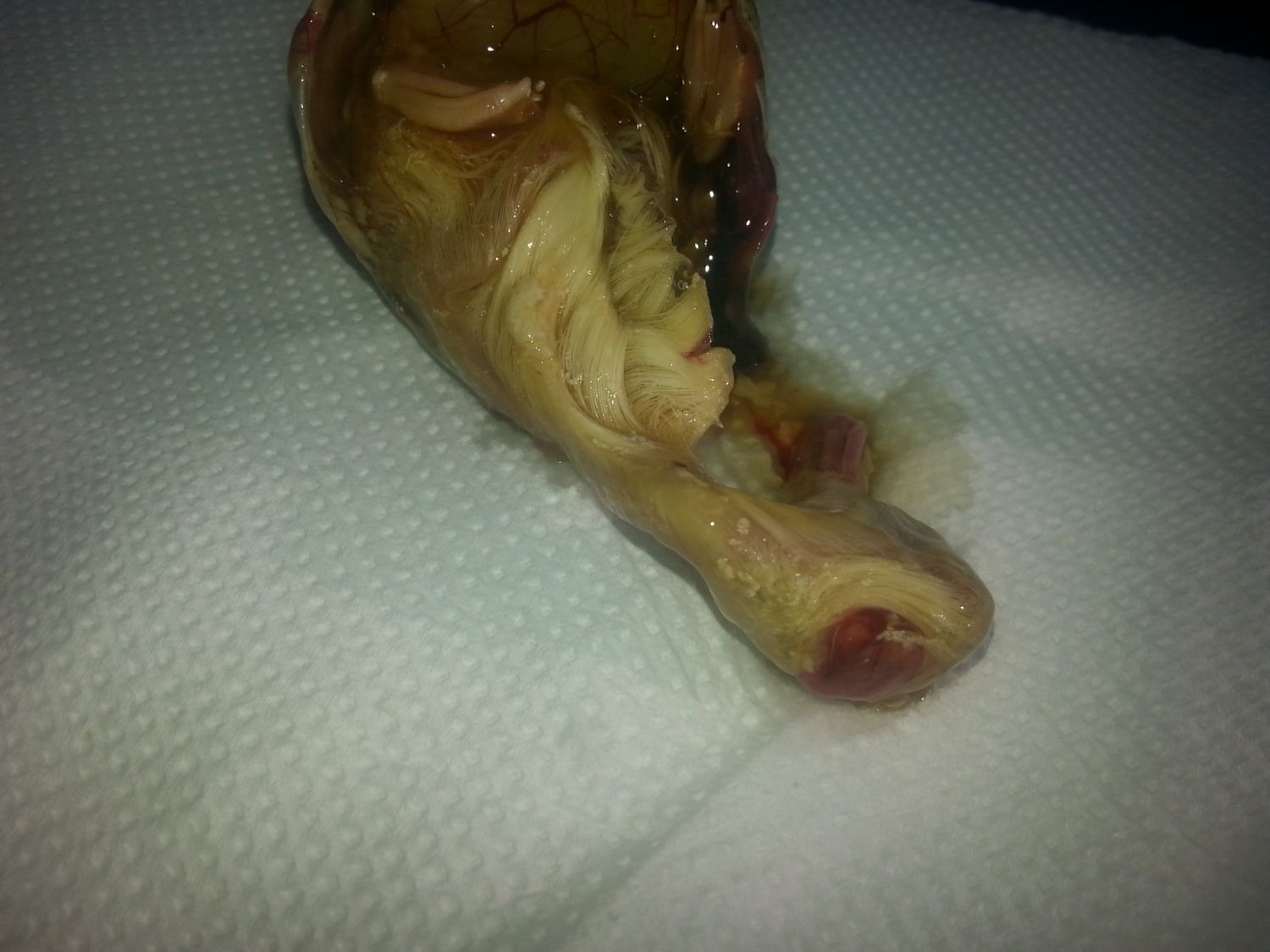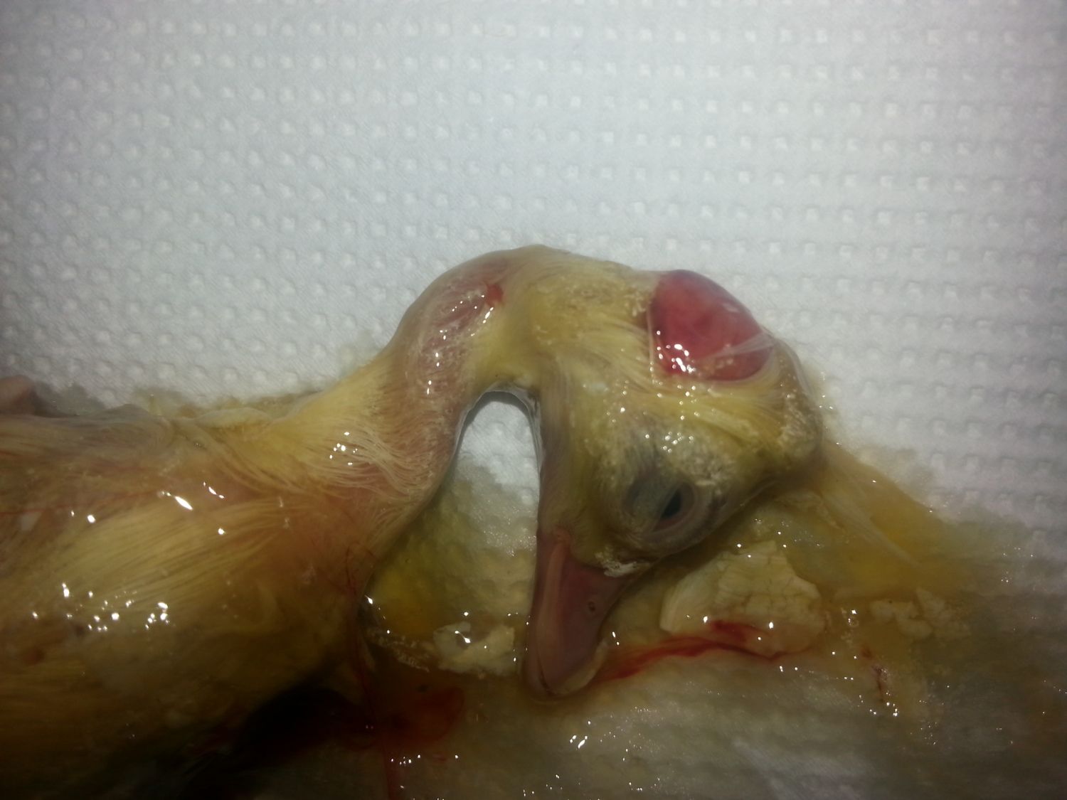 The skull hasnt formed around the brain of the bird and the duckling died at day 22-24 of incubation.