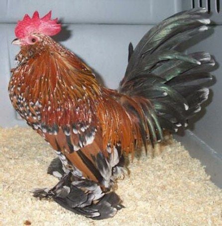 Here is a Mille Fleur D'Uccle Cock bird., See what I mean by deeper red in the shoulders? Among other obvious male characteristics like the flowing hackle & saddle feathers...