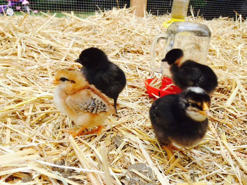 The Sussex is around 2 and a half weeks at the time of the photo, having hatched around the 16th of June. The Orpington mix is a month and a half old, having hatched during the middle of May.