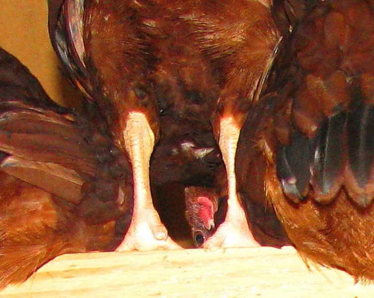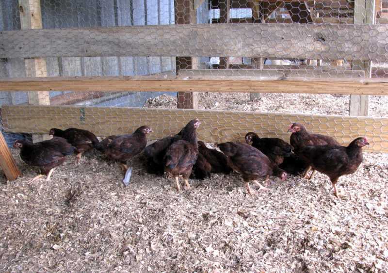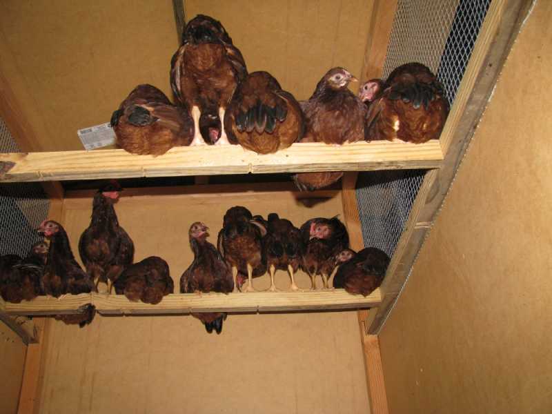 My gang of 14 RIR Bantams in their new 3'w x '5 L coop at bed time . They are 9 weeks old.. Look at the little guy standing on his head.