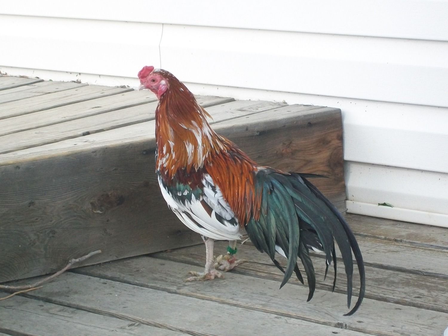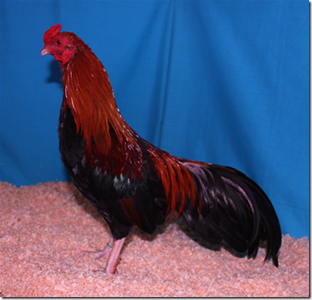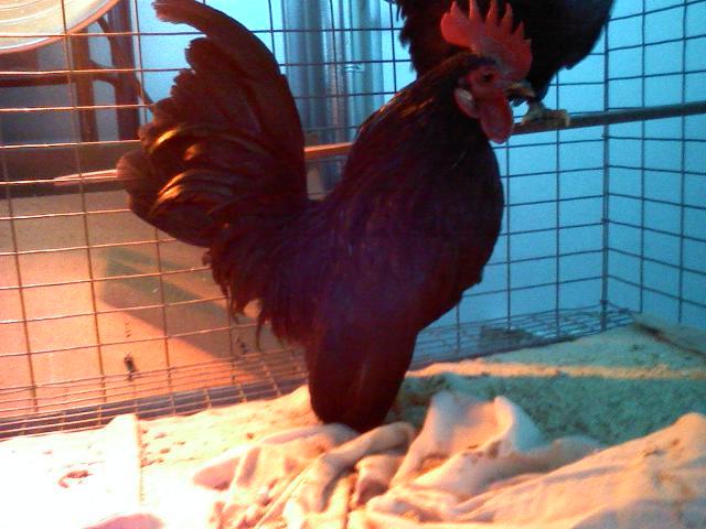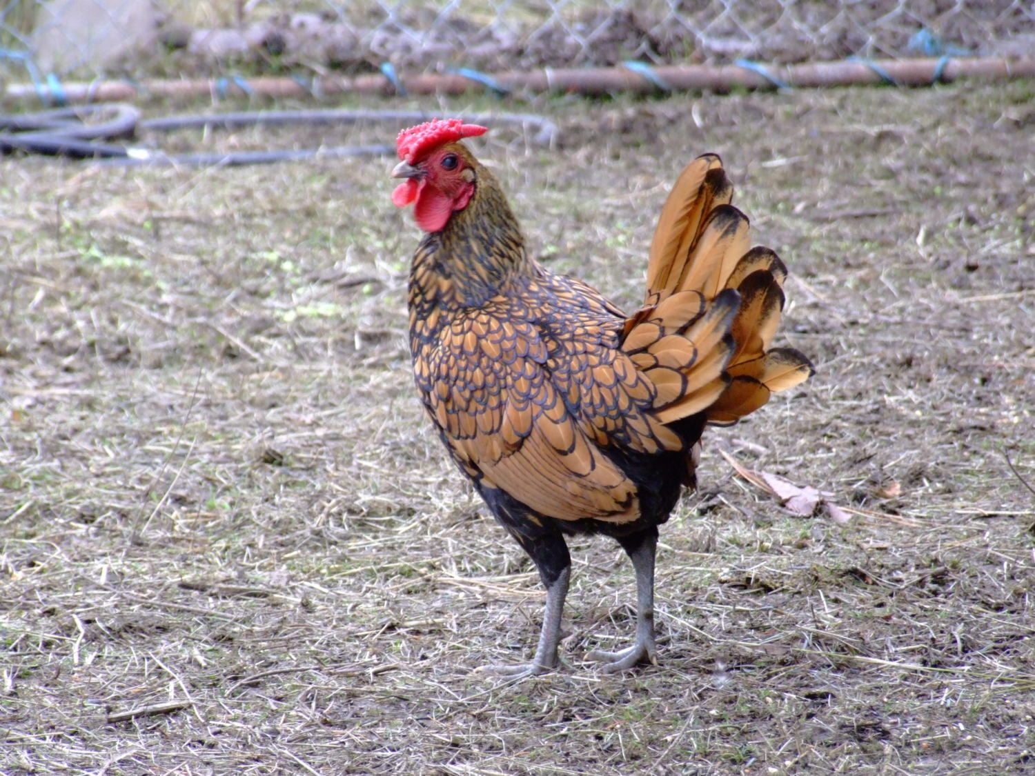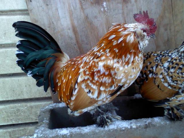 He's a ten month old Gold Laced Wyandotte bantam, but he thinks he's much bigger.......gives our full size Barred Rock rooster hell. If you turn your back on him, he'll run up and peck at your legs; a real tough guy.