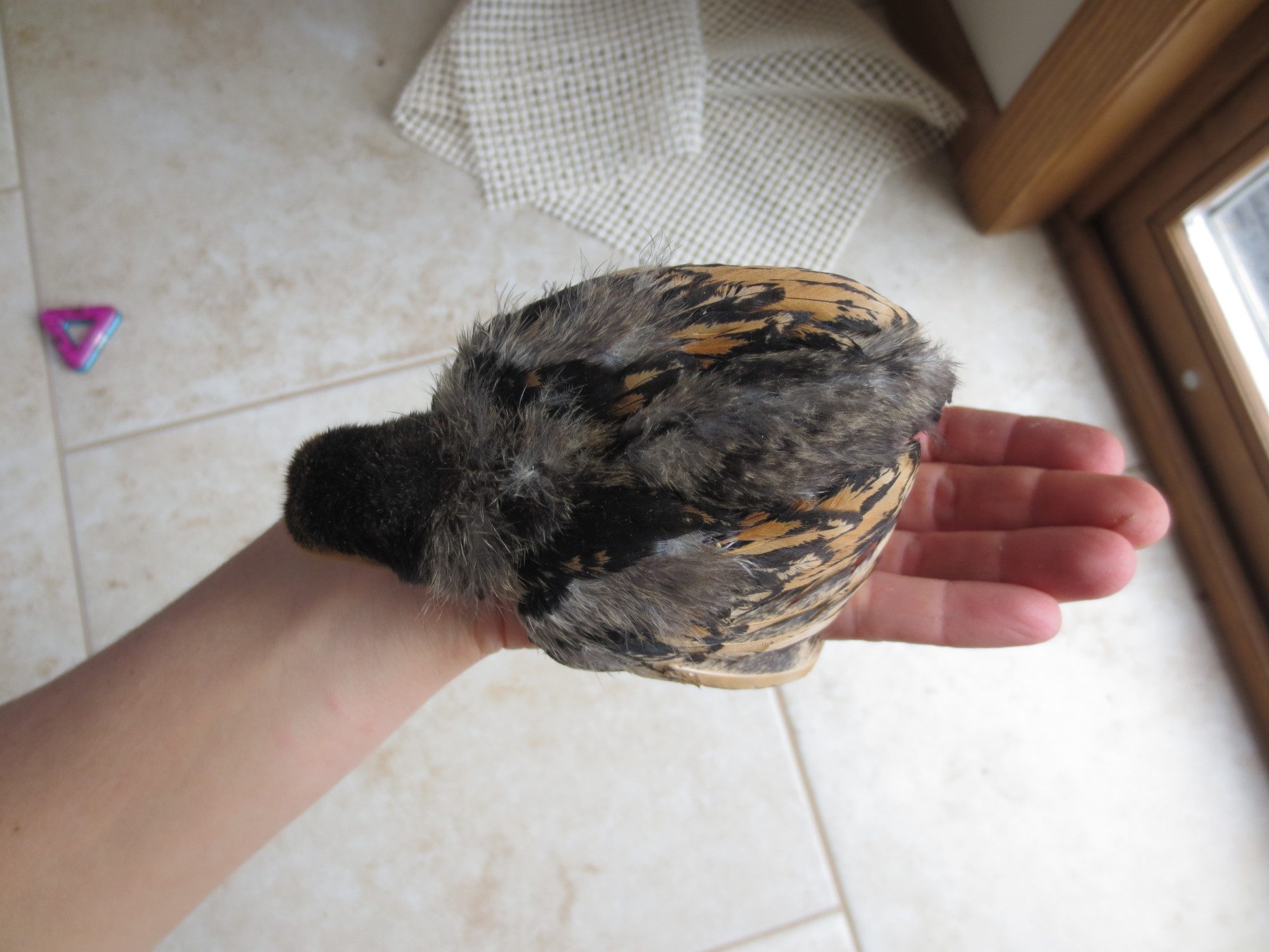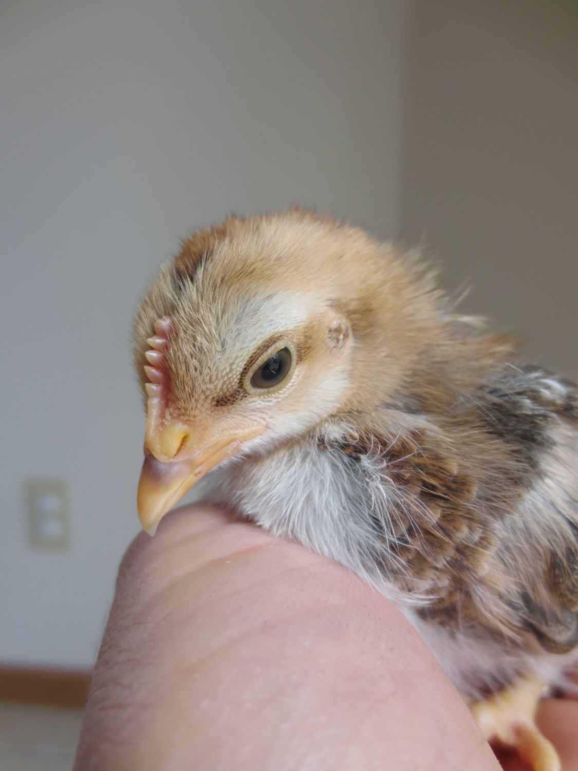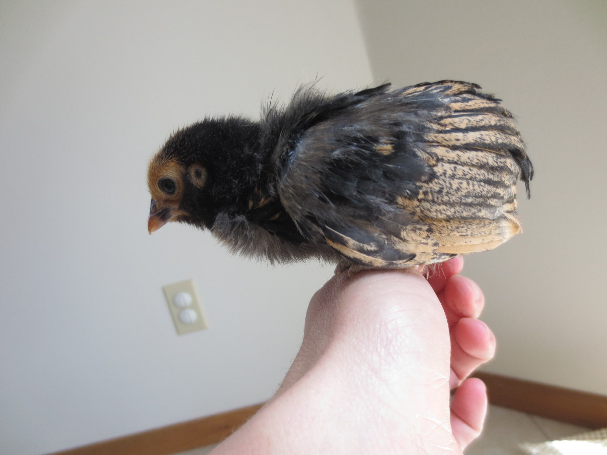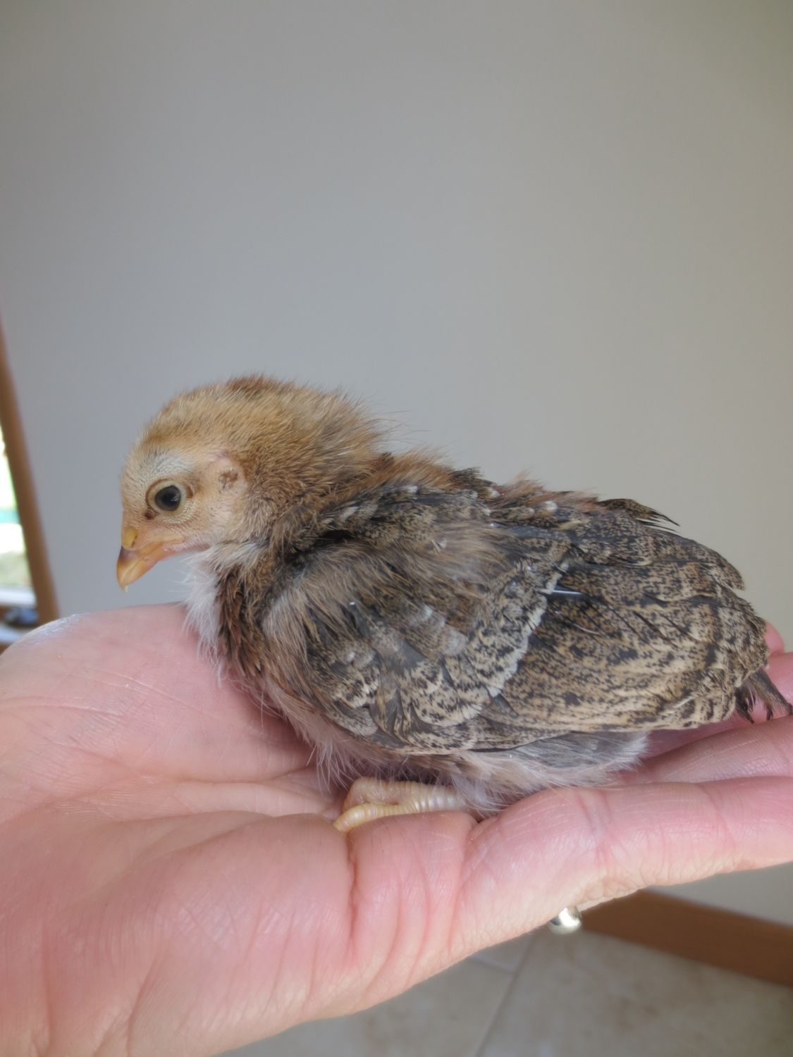 Old english game, thats what my son had last year, but she disappeared one afternoon. Probably due to hawk migration, it was the right time of year. It was the only causality we had. I'm just guessing since this is a little brown chipmunk colored chick. I didn't post a picture of that one. Theres only one of them that has a muff, do all EE bantams have muffs? Because the other 4 unknowns don't have muffs. I'll try to get pics of them all up in a week or so and maybe that will help.