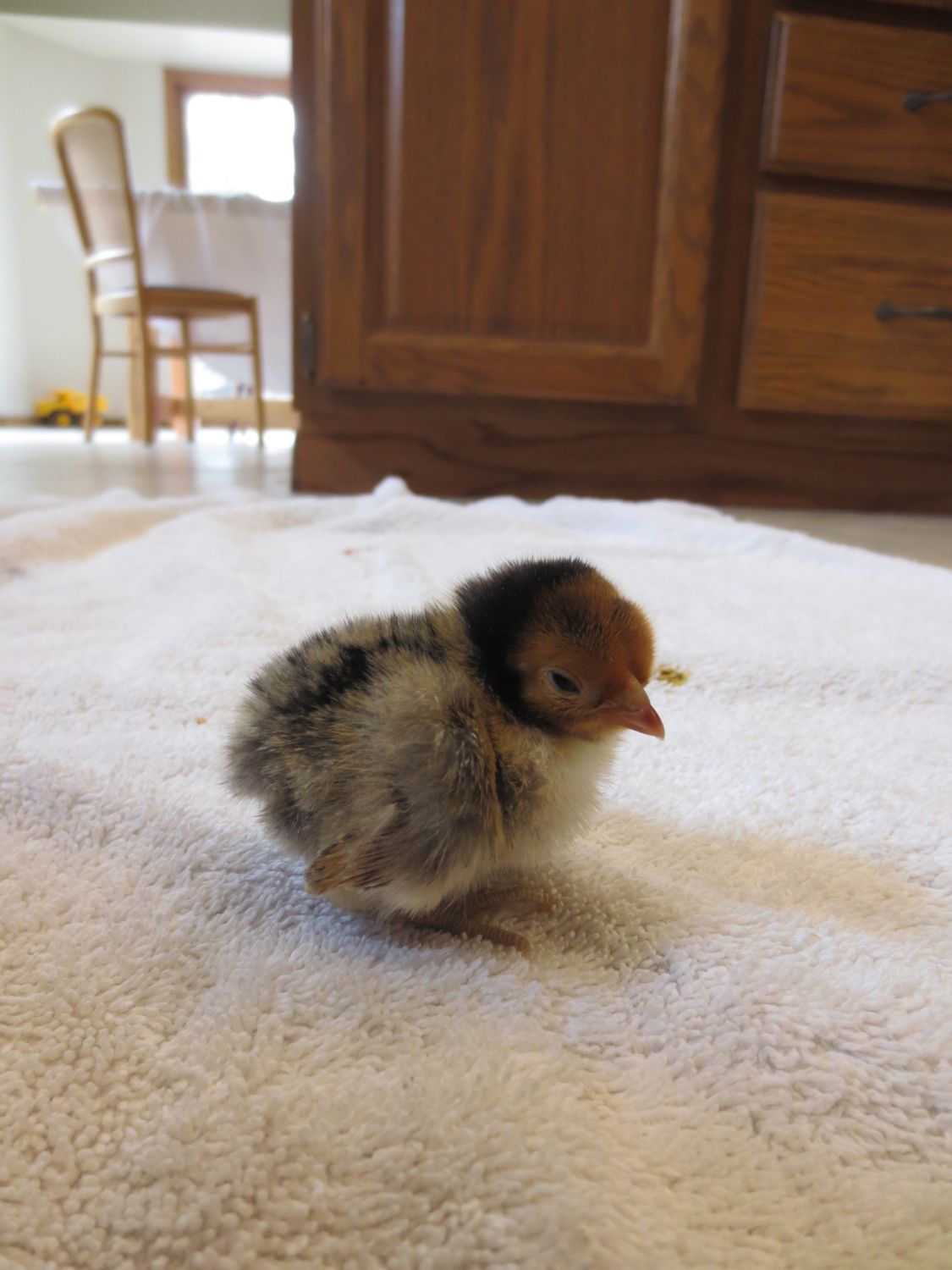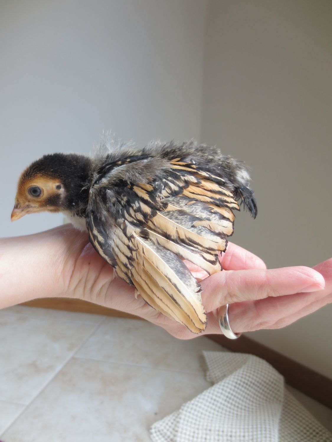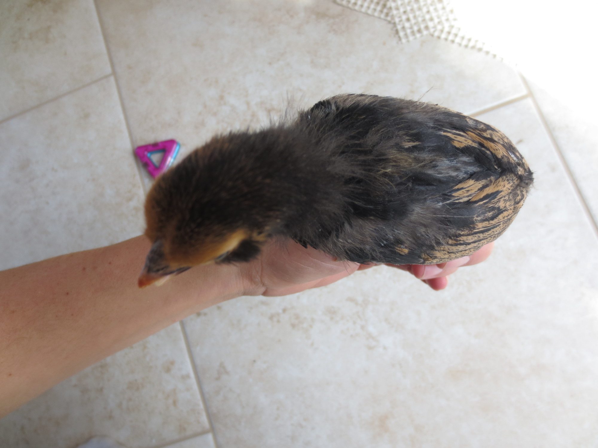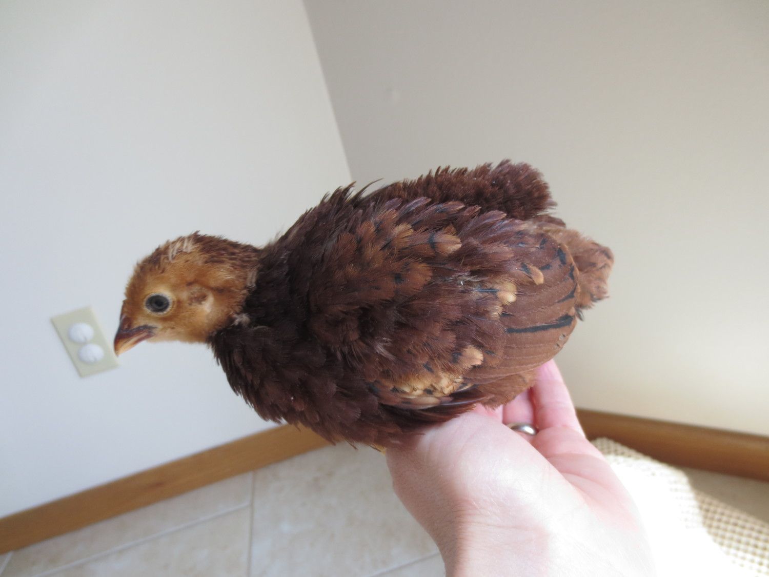 Old english game, thats what my son had last year, but she disappeared one afternoon. Probably due to hawk migration, it was the right time of year. It was the only causality we had. I'm just guessing since this is a little brown chipmunk colored chick. I didn't post a picture of that one. Theres only one of them that has a muff, do all EE bantams have muffs? Because the other 4 unknowns don't have muffs. I'll try to get pics of them all up in a week or so and maybe that will help.