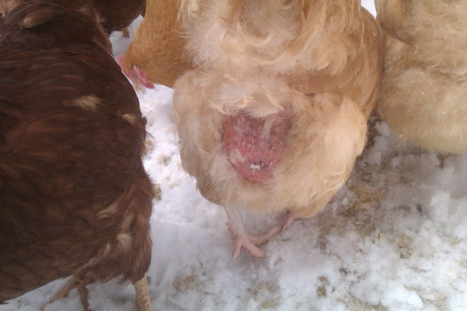 Thanks in advance for your help! It is my first year having chickens, I have 11 (9 heavy breed and 2 bantam) laying hens. I live in Maine and so the ground is frozen and there is some snow on the ground. The girls have a 8x8x8 coop with 3 laying boxes, 2 long roosting poles, and a poop/perch board. They also have a 10x10x4 outdoor pen in which to play (I close this off at night to protect from our many preditors). I recently noticed that 2 of my girls have feathers missing on their butts. I suspect this may be from boredom and pecking at eachother. I have a couple of homemade flock blocks in their pen that they peck at, as well as put vinegar in their water. I'm not sure what else to do! I plan on building them a bigger pen in the spring when the ground is not frozen to give them more space. Does anyone have any ideas? Also, is this from something other than pecking?