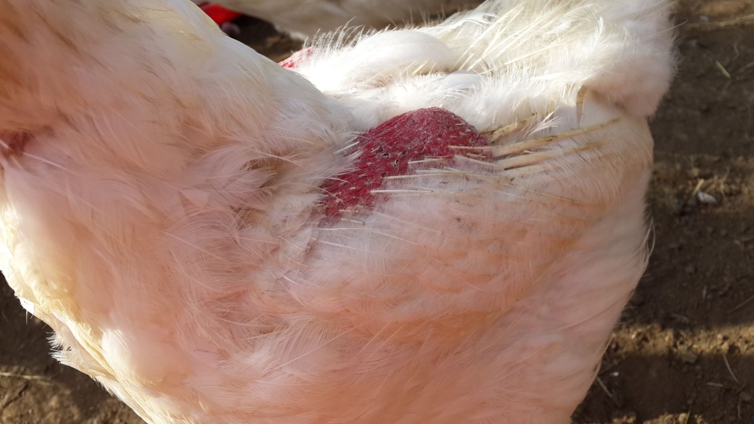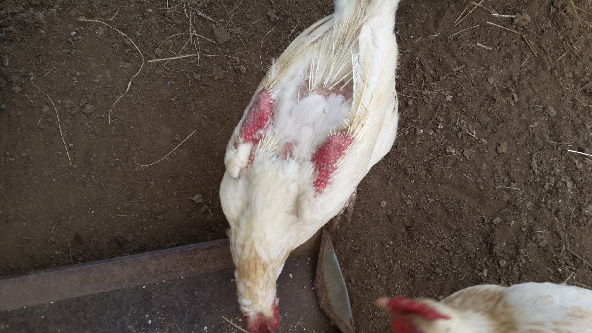 Yep...typical "marks" from a rooster mounting the poor thing...yikes!I'm thinking rooster, also.