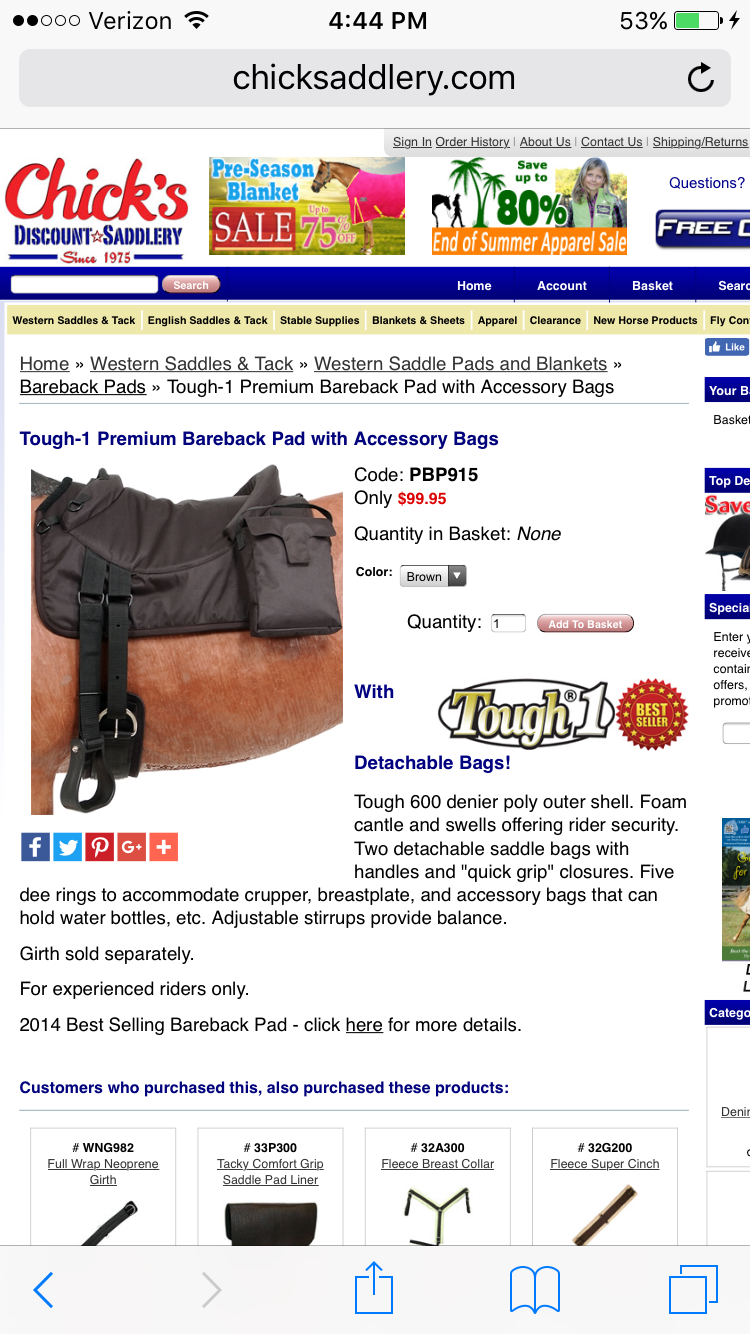 Okay so I have a bareback saddle pad on my birthday list, becuase I like riding bareback but I'm not very balanced yet. Initially I wanted a pad that had a cinch, a handle, and removable stirrups, so that I could practice with the stirrups until my balance got better and then take them off and practice my balance even more. And a strap in case I need to grab on. But I've been reading about how stirrups are a bad idea becuase 1. How it puts your weight on the horse and 2. It actually takes more balance to use them and they're usually fairly small and if your foot gets stuck you're gonna get dragged. So I was like okay I'll get one with a cinch and handle but no stirrups, but now I'm seeing that handles are bad too! Because if you slip and grab the handle you could pull the whole pad around to the side or belly of the horse, and that can be disastrous, especially if you've got your feet in stirrups.