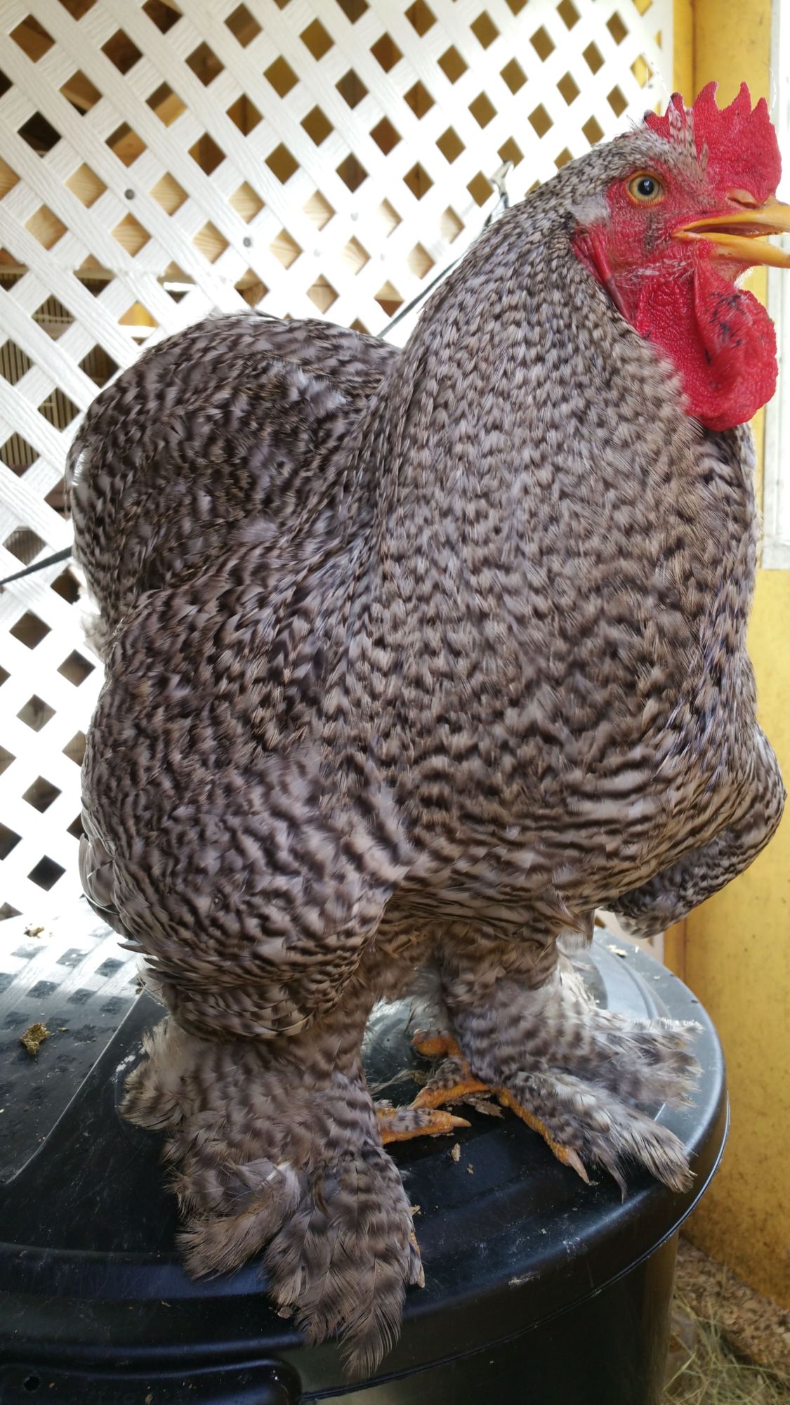 For type (breed characteristics) Tom's hen is a beautiful example of what a cochin should look like in size and shape. Color in barred cochins is hard to achieve and like Tom said they are coming around and in a couple more generations he should have good crisp barring. I currently have some F1 barred cochins (project) that are about 9 weeks old, all males and will be crossed back to black females this spring. The barreds are not common but are still in existence and breeders like Tom are working not only to keep them around but also up to the Standard description. Thanks Tom!