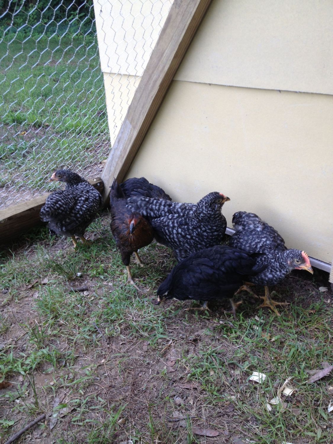 My daughter got 6 chicks as a bday gift. I'm unsure what I have. There are just over 7 weeks. The far left looks like a barred rock pullet(based on the build and the way it acts), the 2nd from left and very back look like black sex link pullets, the small one in front looks like an australorp (pullet or cockerel?), the 2 barred ones on the right end are much bigger and have distinct combs (barred rock or sex link?) I'm new to raising chickens, so these are just guesses I've come up with searching on here and other sites.