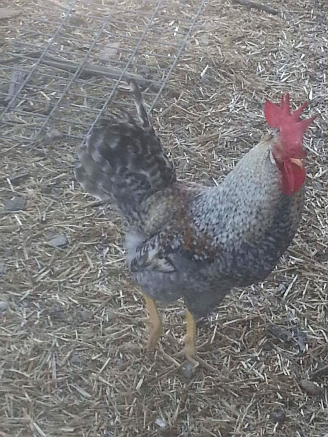 x2He is neither. He's a mixed breed. His white skin rules out both Barred Rock and Legbar. Legbars have white earlobes, he's got red. He might have some Cuckoo Marans in his lineage, but he is most certainly not 'pure'.