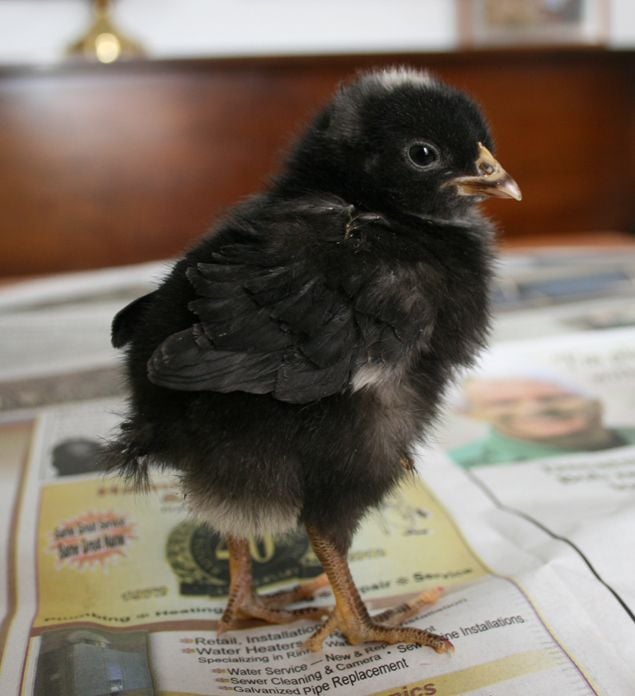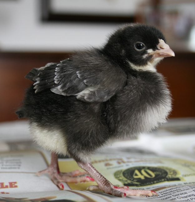 First chick is the Marans; second is the Barred Rock. No, the red toenails aren't standard, they're just for me.