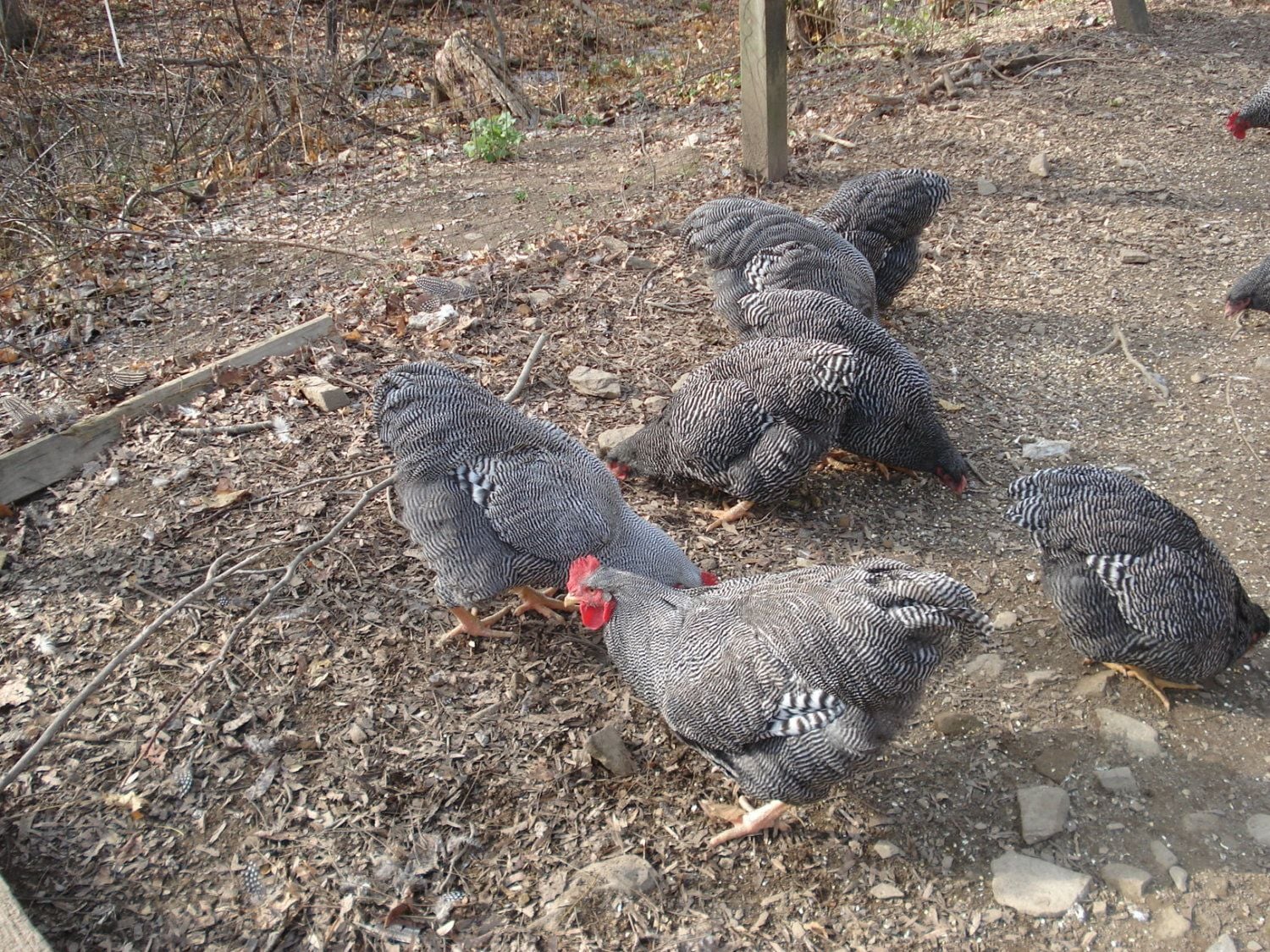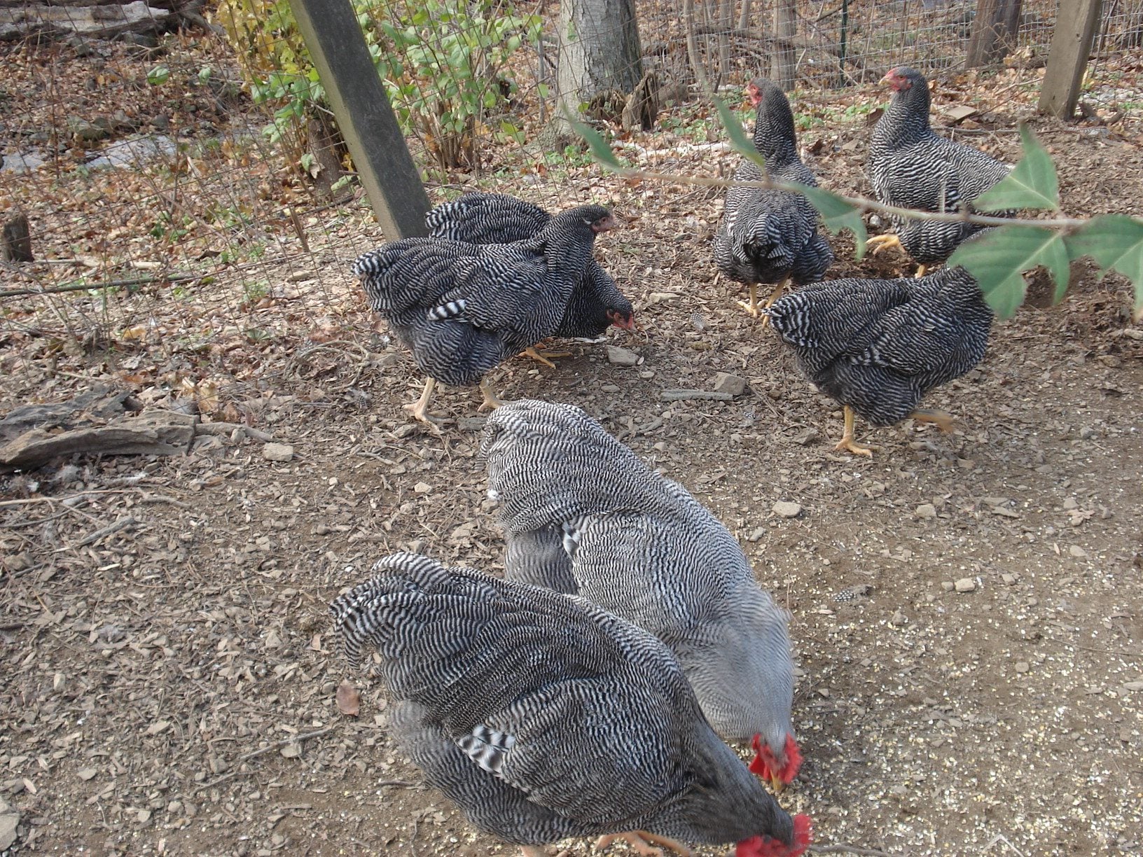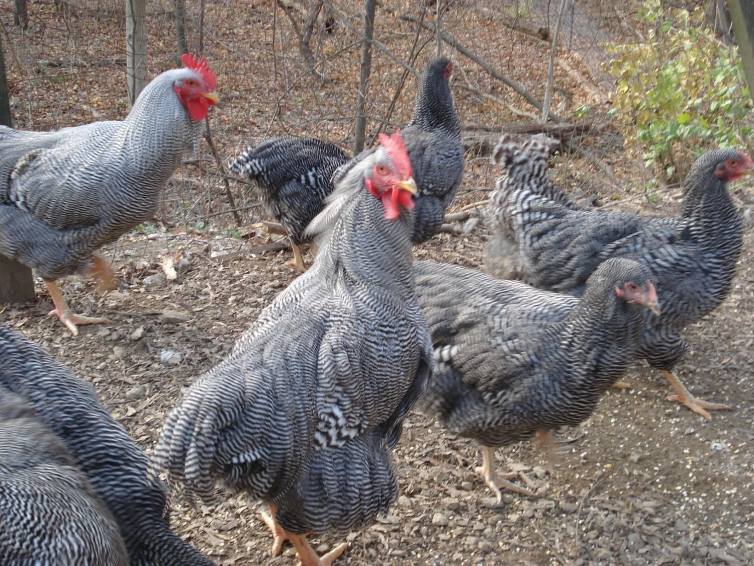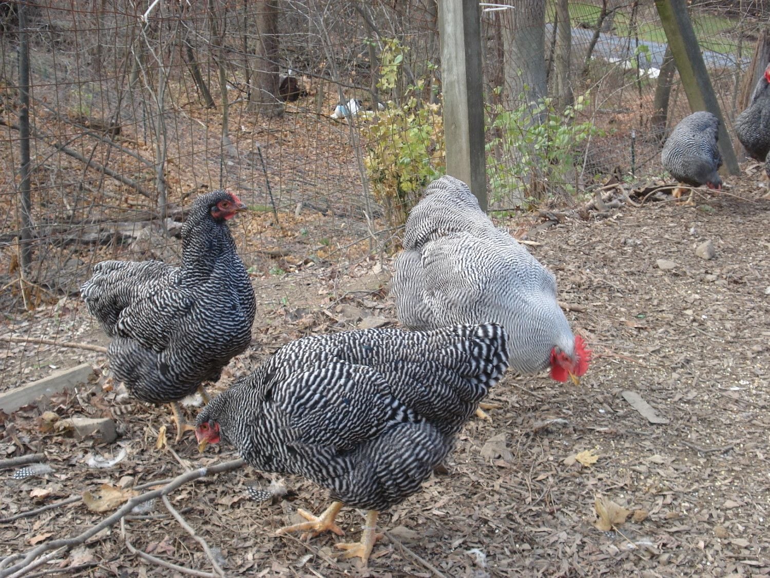 These are birds from Jeremy approx 6-7 months old. I had four other cockerels that decided to move outdoors.There on a Friday night (Outside fence and I was working) gone Saturday. Never did find them and I assume they were ground roosting and a fox or coyote got em. All dissapeared in one night. Still have seven pullets and three cockerel's behind a tight 8 foot fence now. No more free ranging until I get a bunch on the ground. Gonna hatch in the spring.
