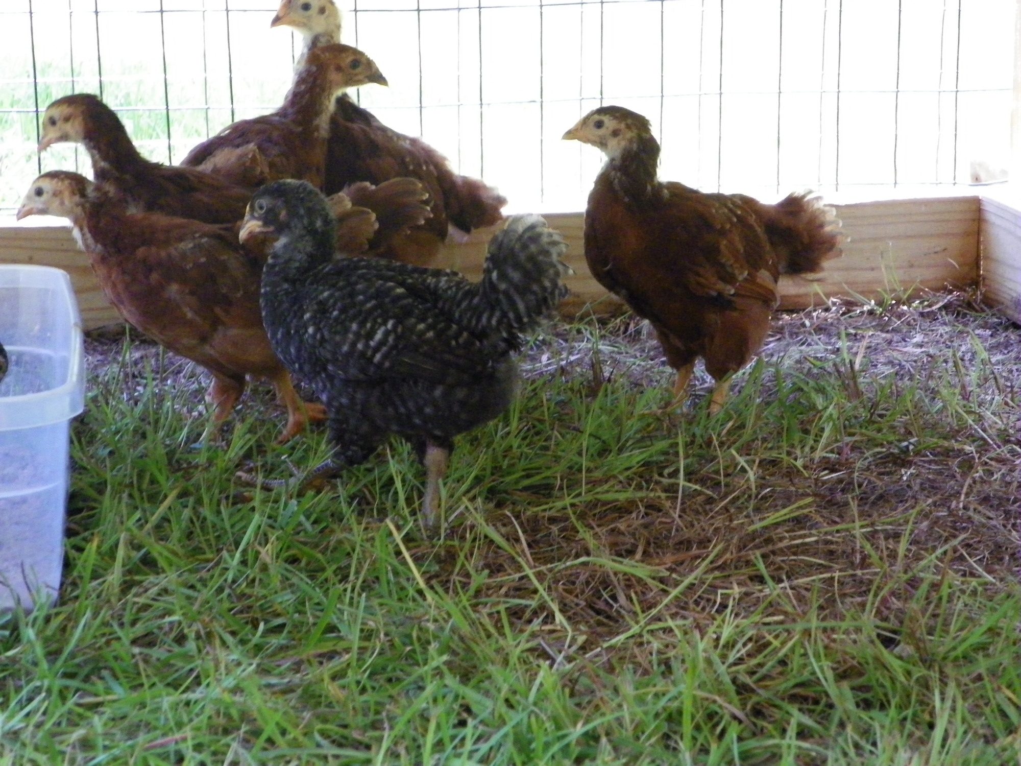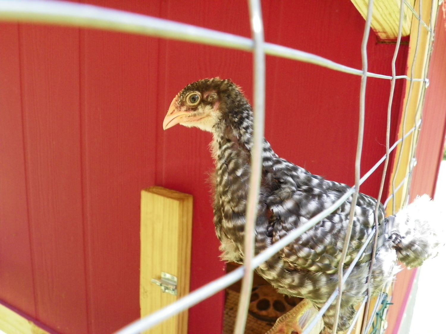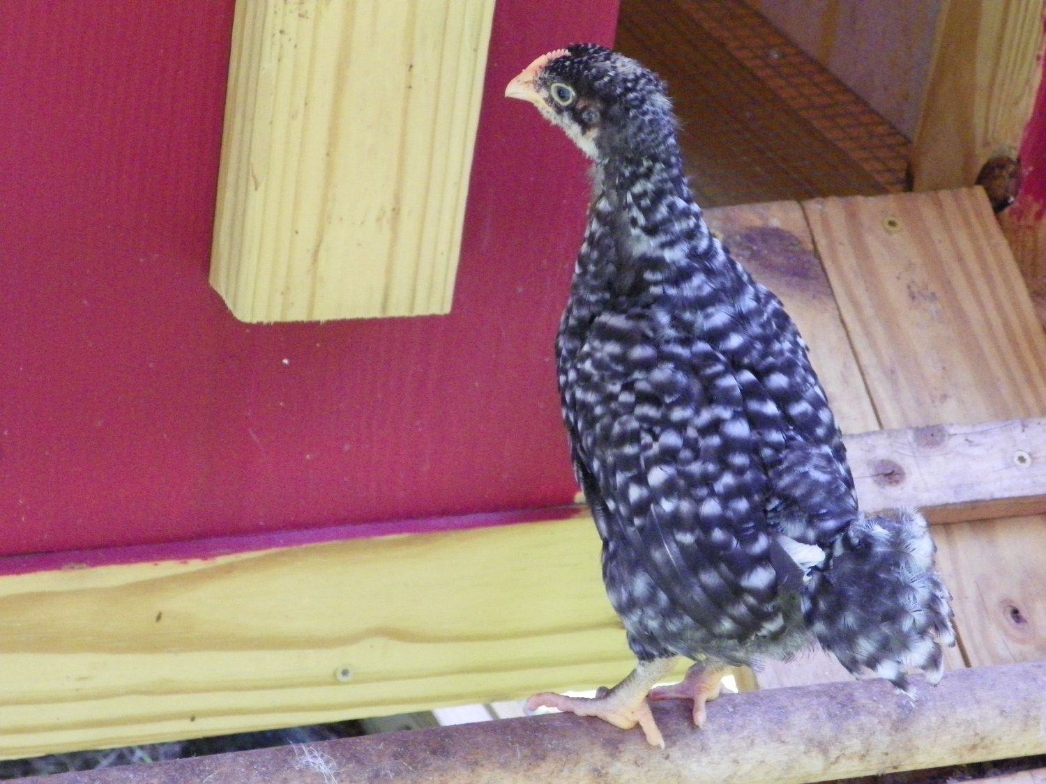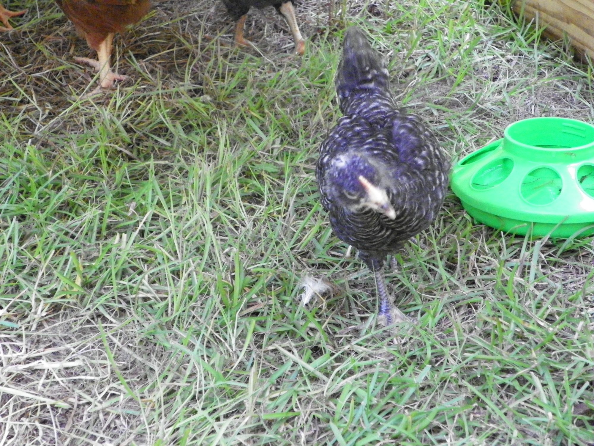 The males carry two genes for barring. Thus, the male presents with barring far different than the female. The body types are also different. The male is designed to stand tall, to be watchful over his flock and since he doesn't lay eggs but rather mounts the females, his legs are taller, thicker and his body is shaped differently. His comb matures at 7 weeks and shows red, as well as sprouting red wattles. The females, the pullets, do not display these secondary sex characteristics until nearer the onset of laying. The females barring, with one gene, gives the bird a darker, blacker appearance. The female is lower to ground in body stance as she needs to be mounted for fertility and lower to the ground to lay eggs.