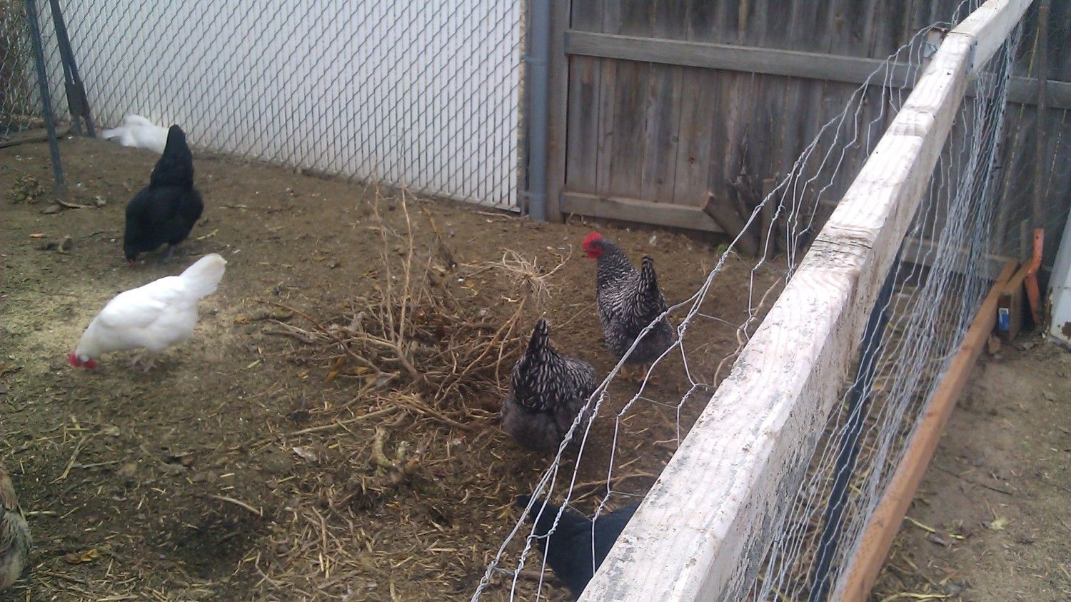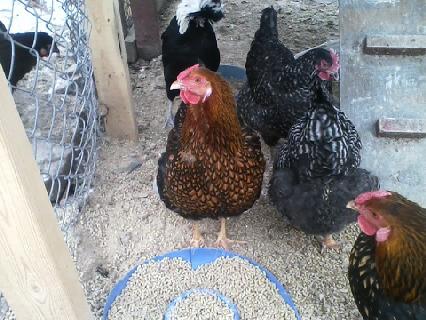 My layer pen, Barred rocks, Golden Laced Wyandottes and my banty Polish who rules the roost!