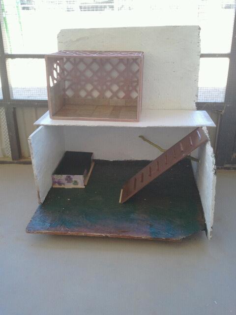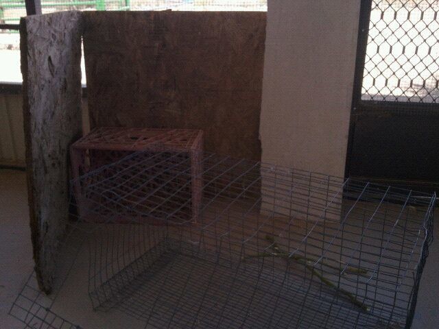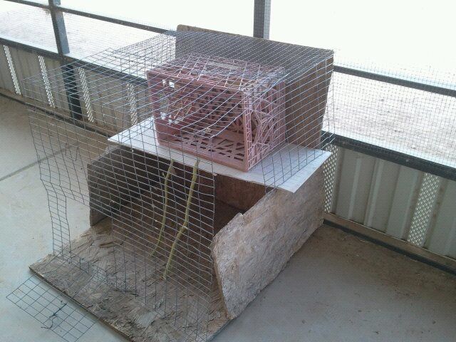 4 pieces of plywood, a piece of cement board (left over from a college art project), a milk crate, branches from the palo verde in my yard, and two old rabbit cages I found behind the house, (the lady who lived here before us was a hoarder of things)