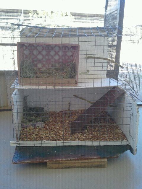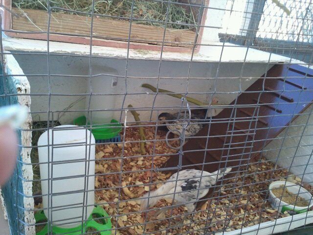 Bedding and shavings added, perches placed, as well as the rabbit cages taken apart and now installed to keep them from getting out. I Like to call it "Bannie Mannor". Now to add the peepers.