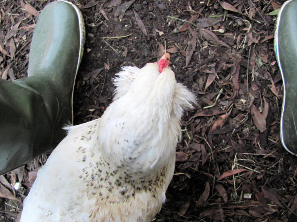 My favorite Splash English Orpington baby, Kate. She has quite the stubborn personality, she's decided her new favorite place to hang out is the garden... and apparently loves geraniums... It's a good thing there really isn't anything growing right now.