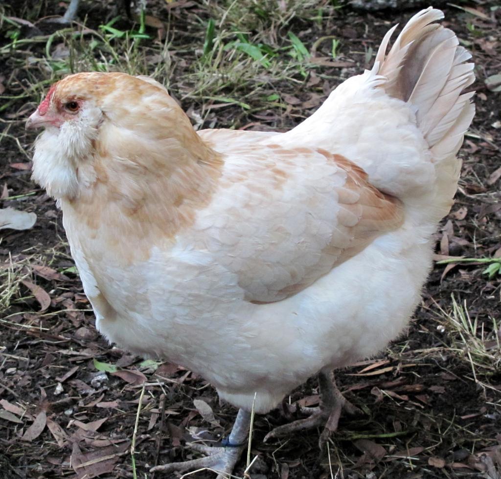 This is my newest addition, a Delawegger we've named Ethel. She's the result of a Del roo over a Wheaten Ameraucana hen, she lays a very pretty pale olive green colored egg. I'm pretty smitten with her.