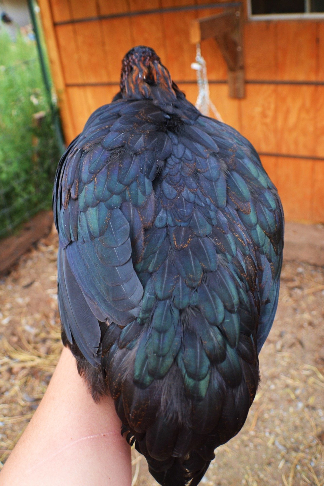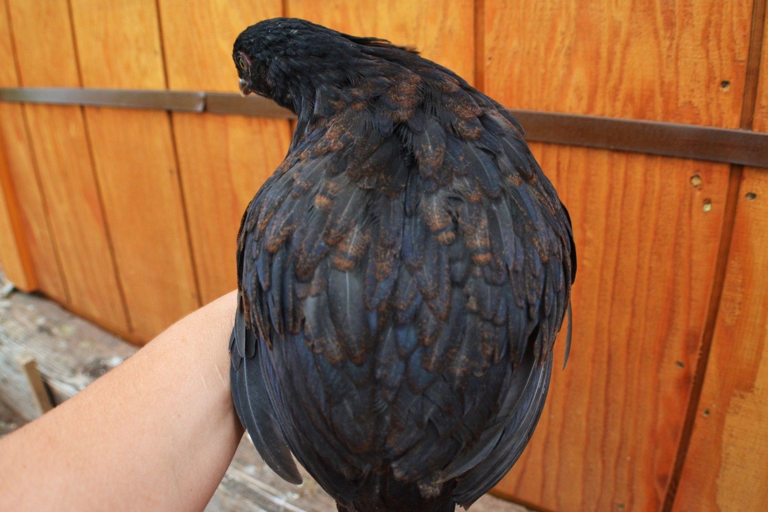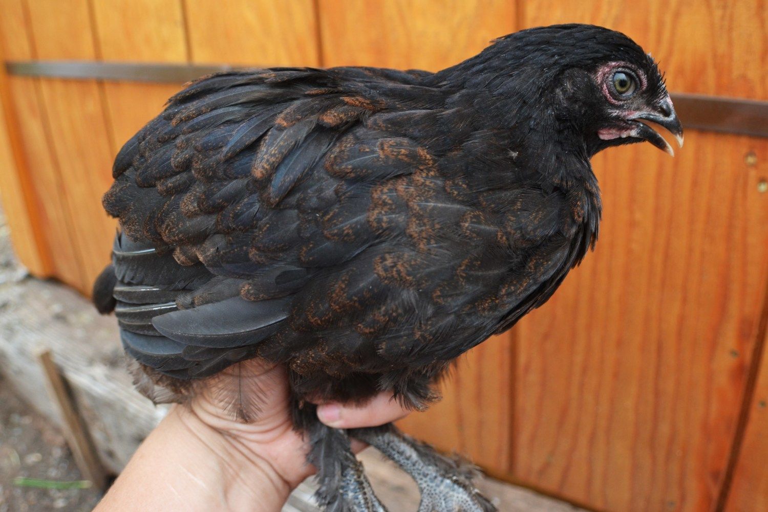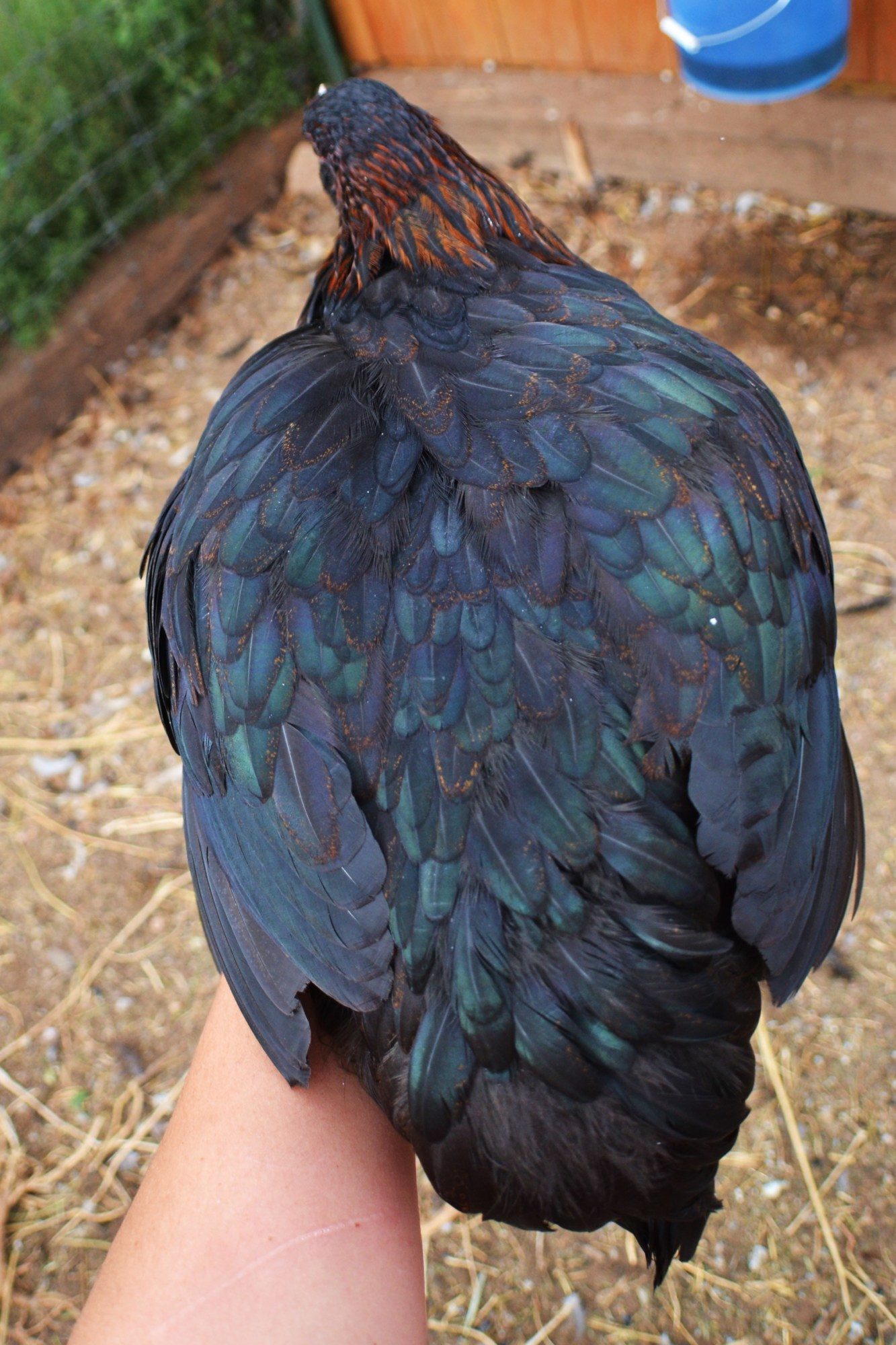 Update: Hey all, I just wanted to post another update on my mossy pullet, whom I named Mossy :) Here are some new pics of her, she's now over 14 weeks old. As she's grown it seems the mossiness has toned down quite a bit, blending more into the black of her feathers. I wonder if she'll lose more of that mossy edge every time she molts, it's interesting how much she has changed over the past 8 weeks. She is gorgeous! :drool