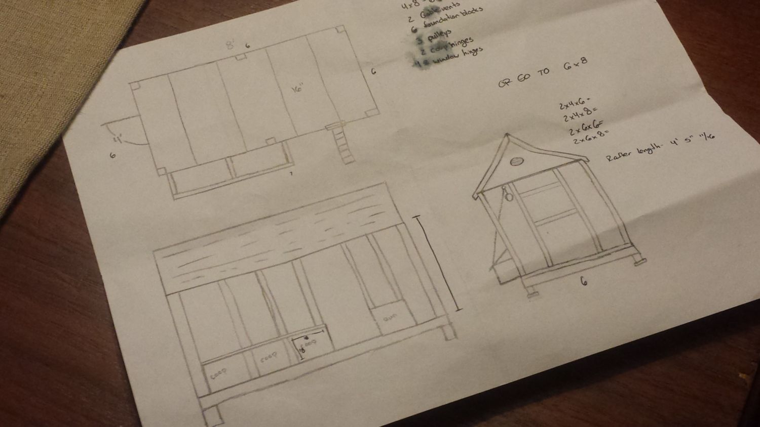New here to this site and wanted to show our families progress of our journey to raising chickens! This whole endeavor started with us getting a small pot belly pig last year and then wanting our children to grow up with responsibilities and good fresh food. My wife and I have a 15 month girl(who loves animals) and another one on the way. So we decided to start the journey of raising chickens! We ordered 6 barred rocks the other day so need to get the ball rolling! I started looking at plans while at work for probably 16 hours, while I ended up drawing 4 or 5 different plans. So I ended up with this: