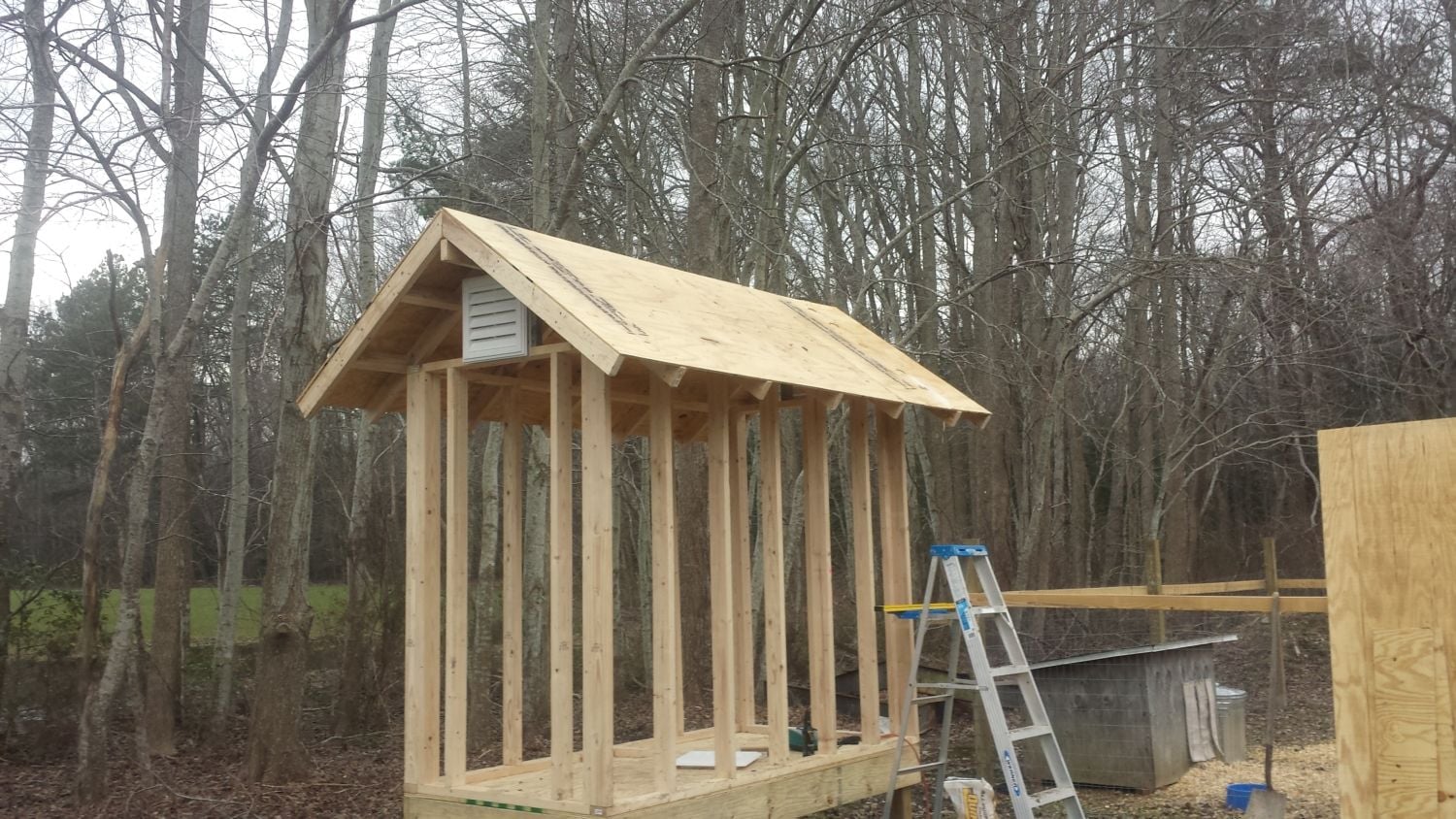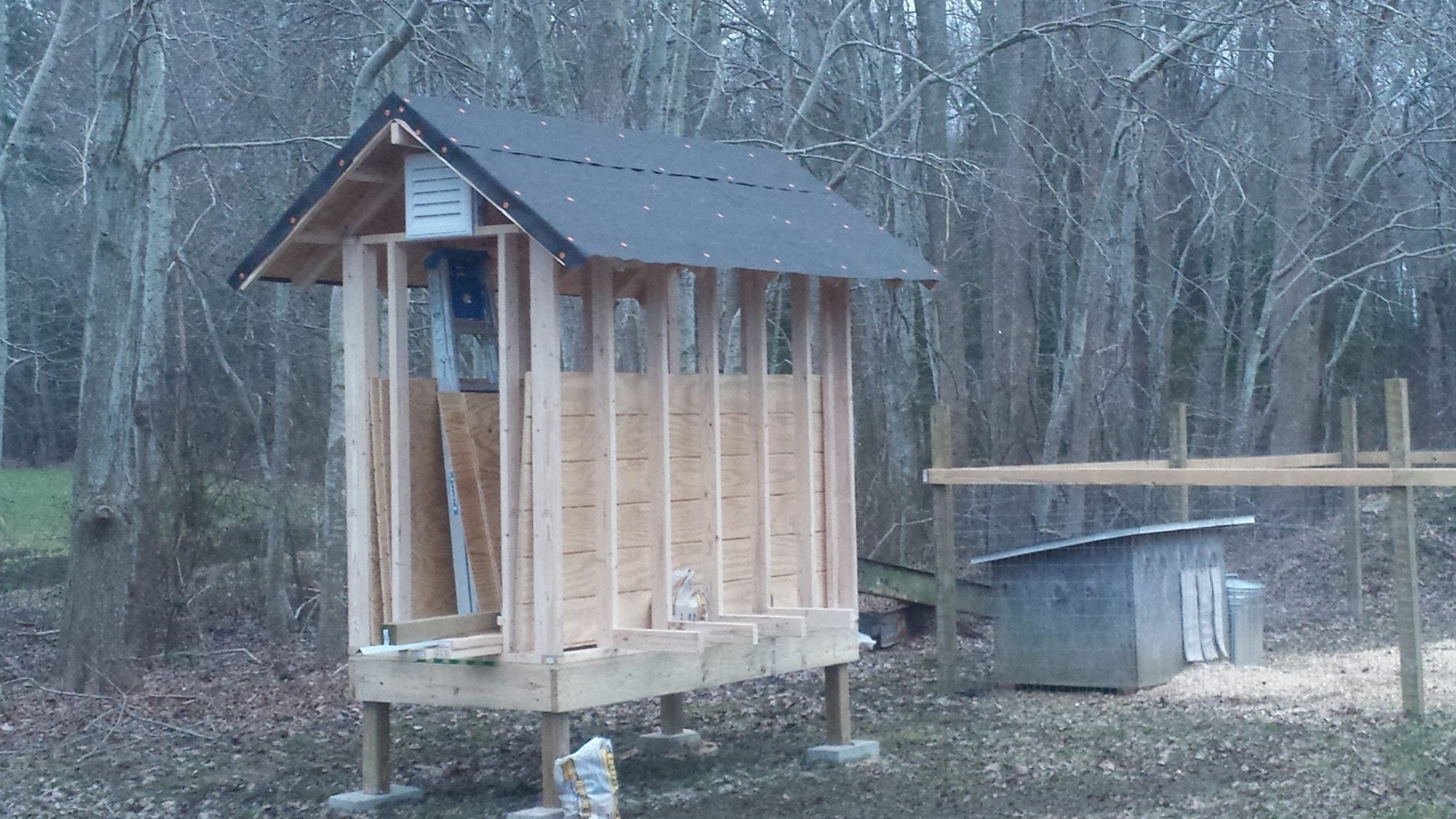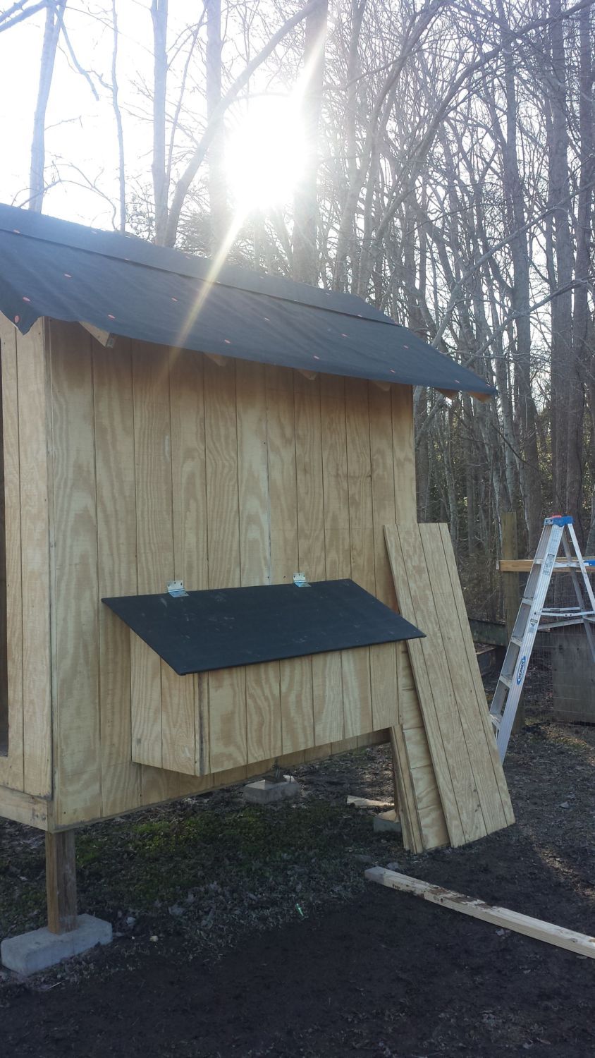 You can see the 3 coops here, leaned up against it is the roof that will have hinges to open. Siding is T1-11 siding panel.