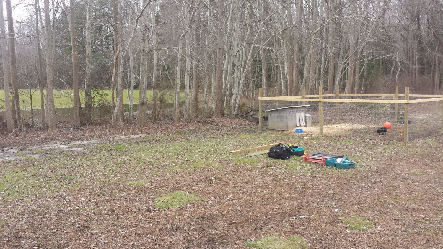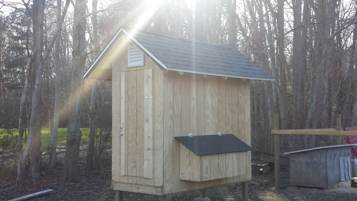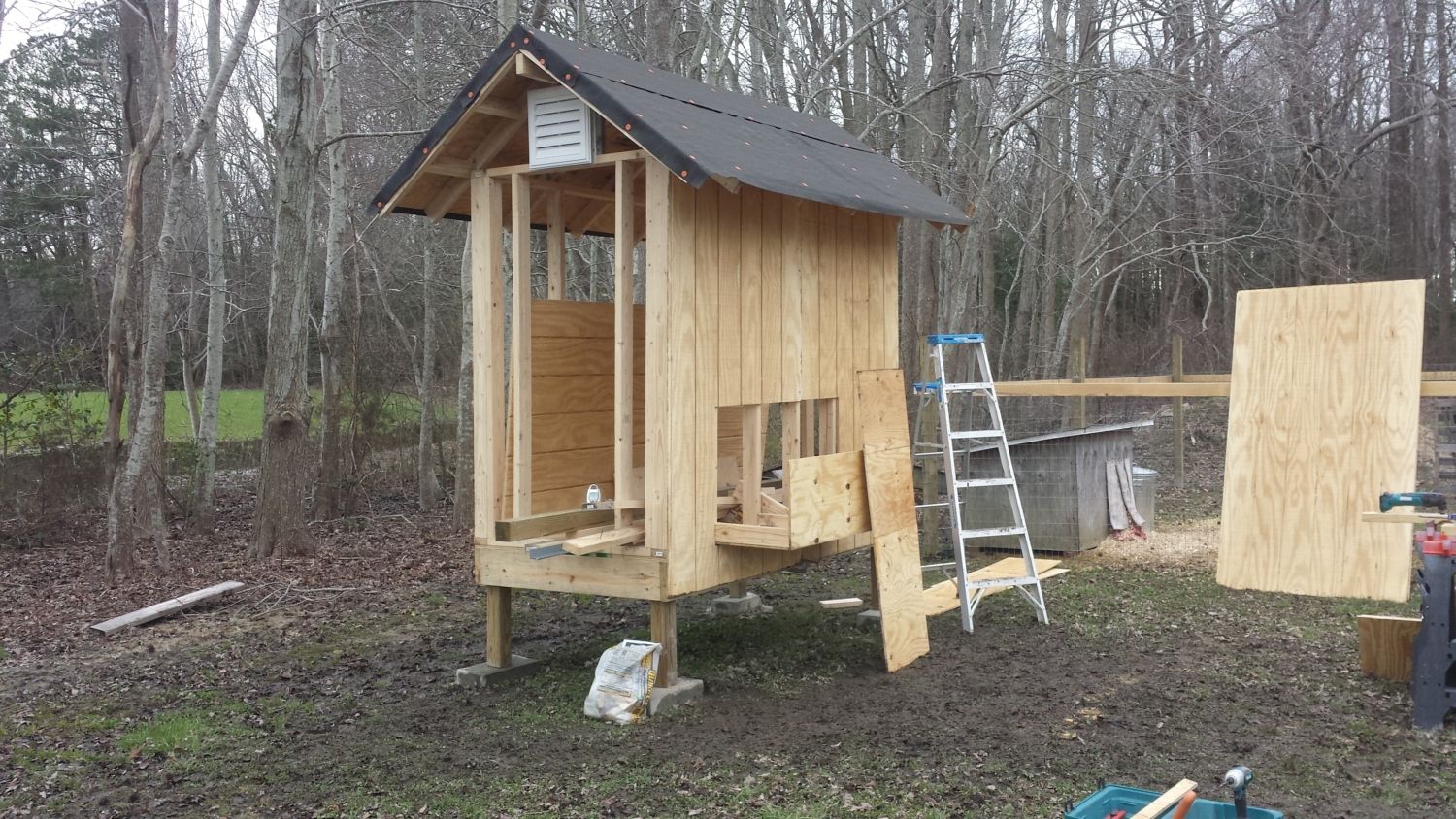 You can see the 3 coops here, leaned up against it is the roof that will have hinges to open. Siding is T1-11 siding panel.