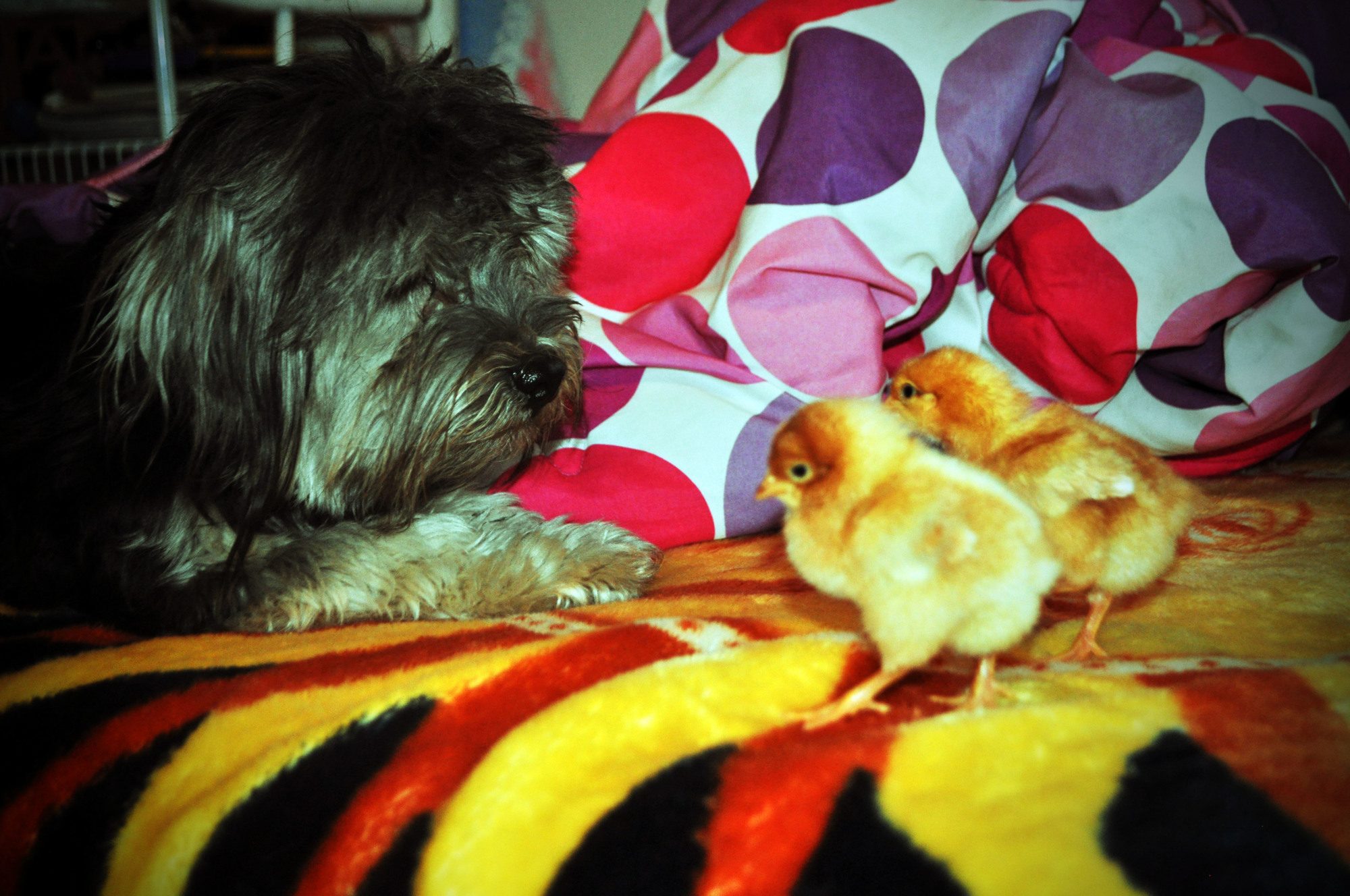 So I have six baby pullets living in my girls room. And we keep the big dogs out of there while my two Havanese are scared of them and run. I just finished their new brooder using a swimming pool and chicken wire. Now the dogs can see them since they were living in a card board box. I've taken some of the babies out and aloud Dublin to check them out this week. He's the biggest wuss I know. Well tonight he has kept a close eye on those chicks! When our alpha dog (Checotah) came up to see what it was, he tried to take Checotah's head off and refused to let him get near them. Then my daughter went to pick a baby up and he started growling at her! I'm shocked he has reactted this way since if you even raise your voice he runs and hides. I wonder what's gotten into him tonight.