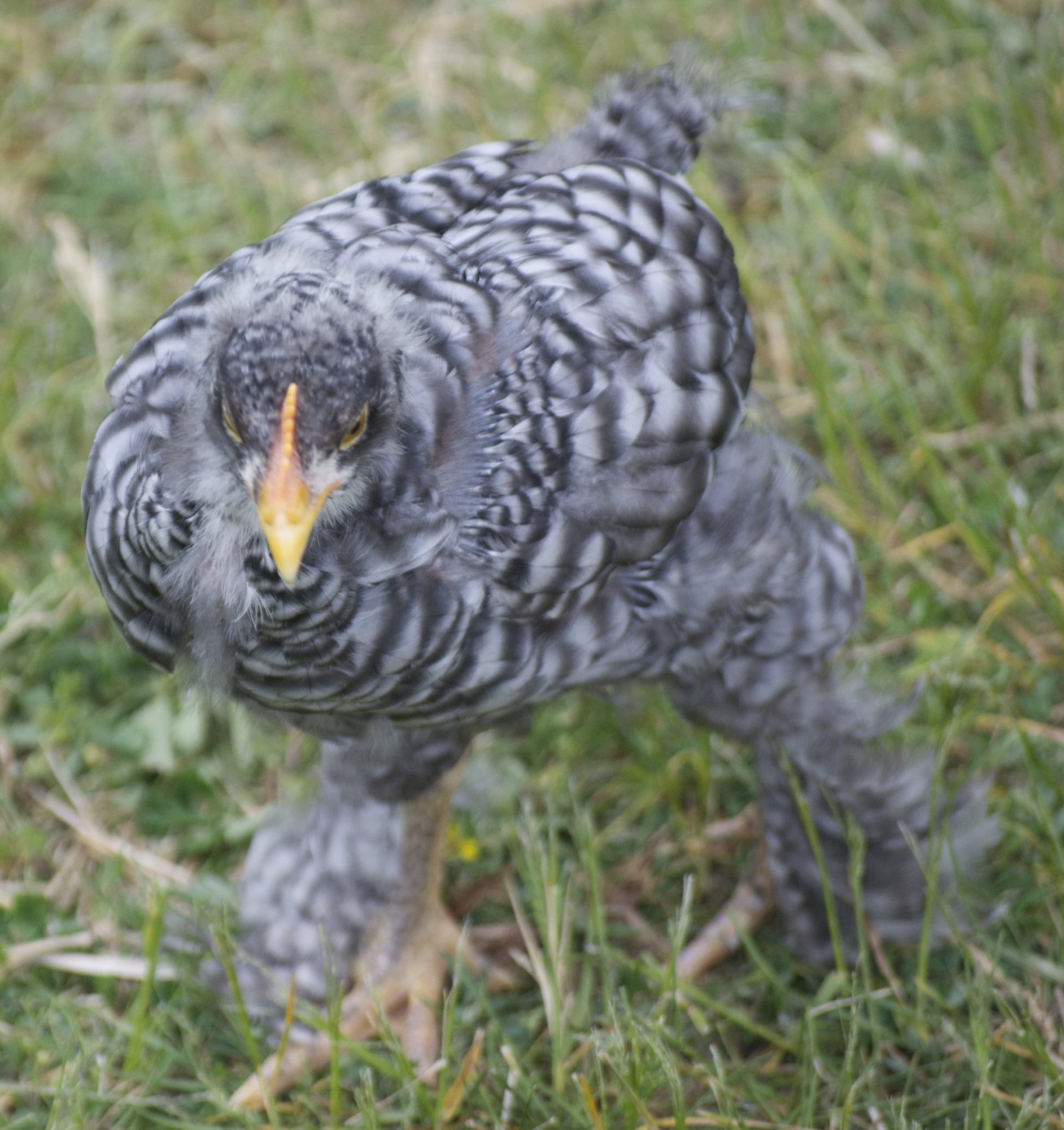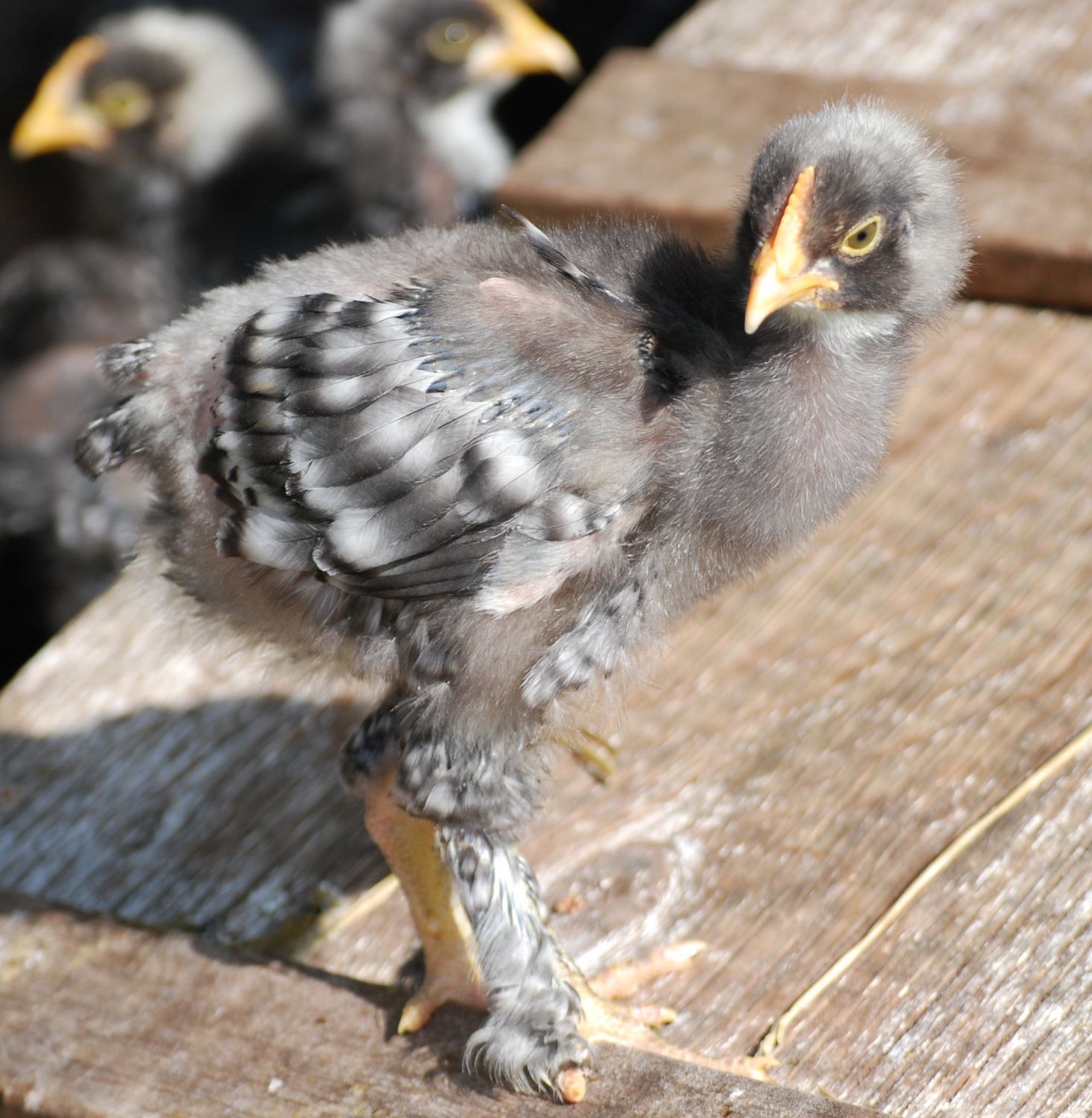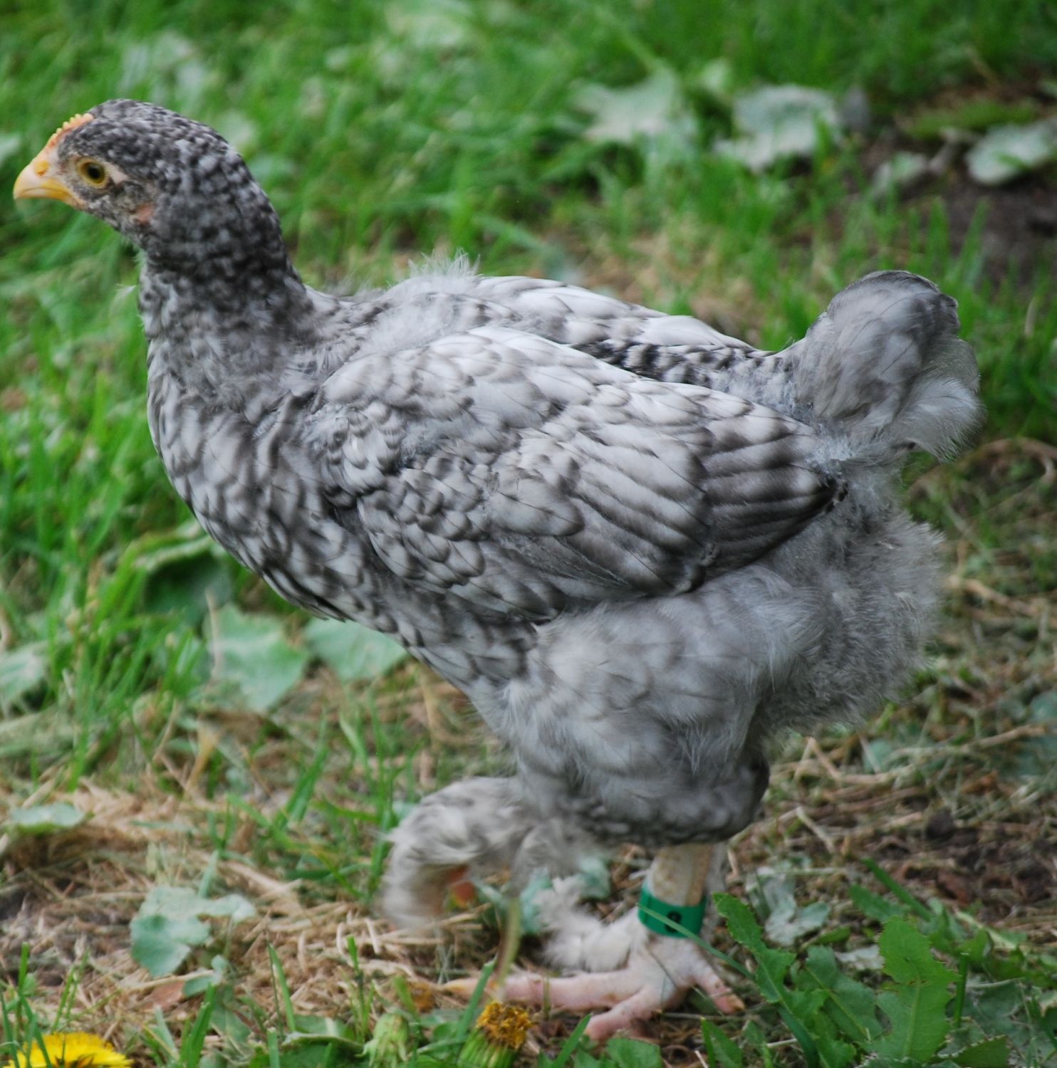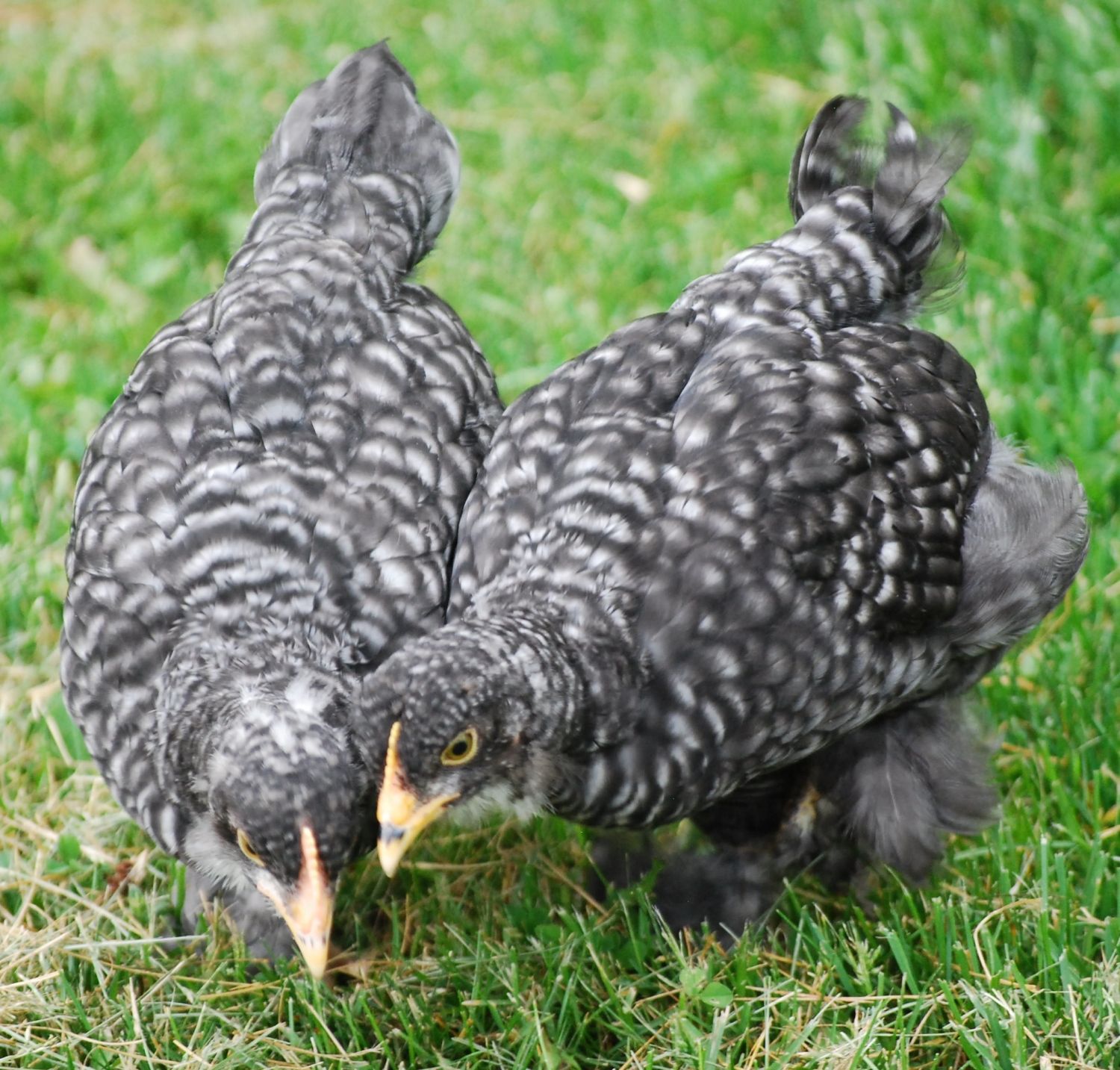 New line chicks at 5 weeks old. It appears with my birds that the barring is less defined. Nice, broad heads & leg feathering on the pullets.