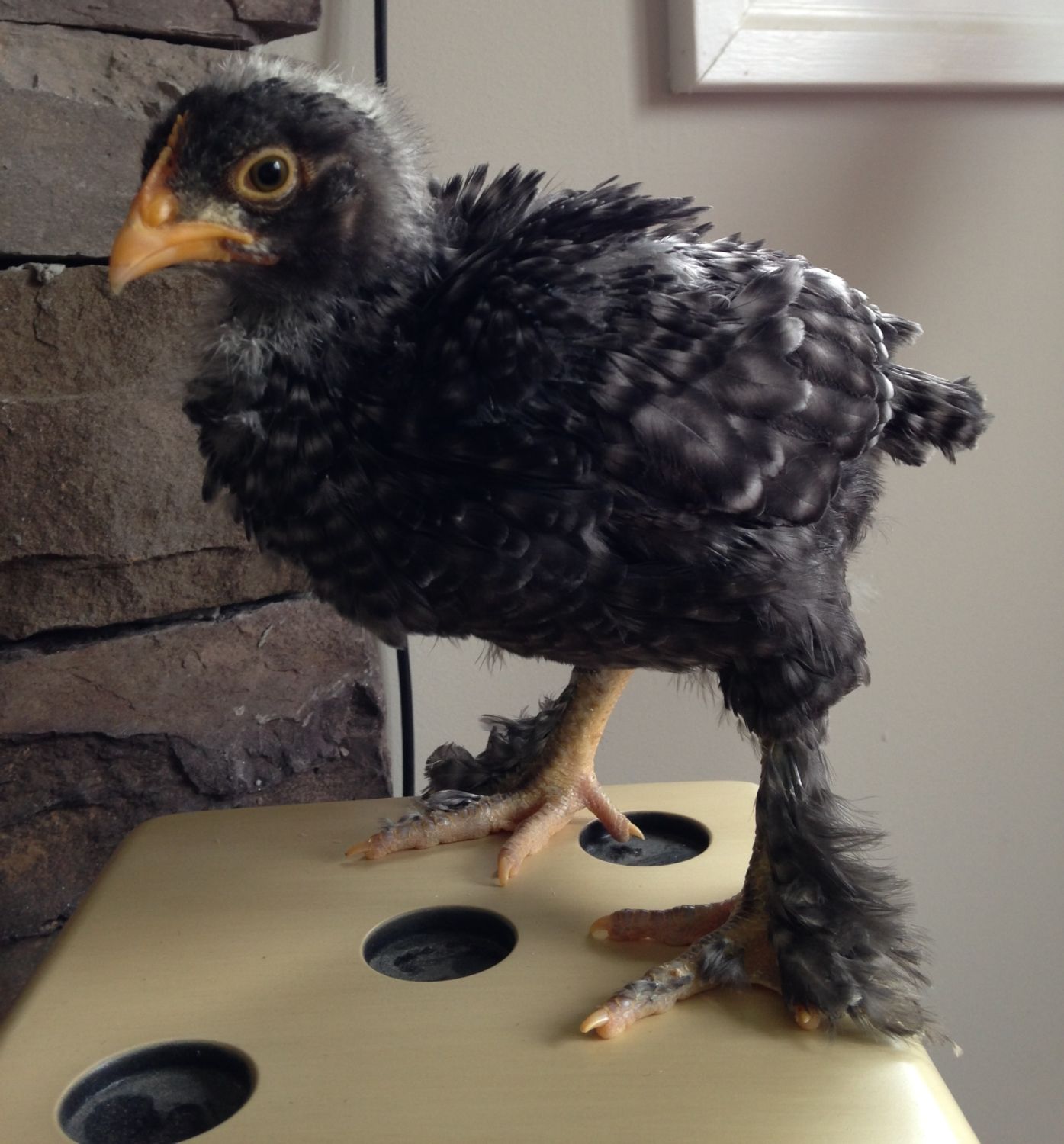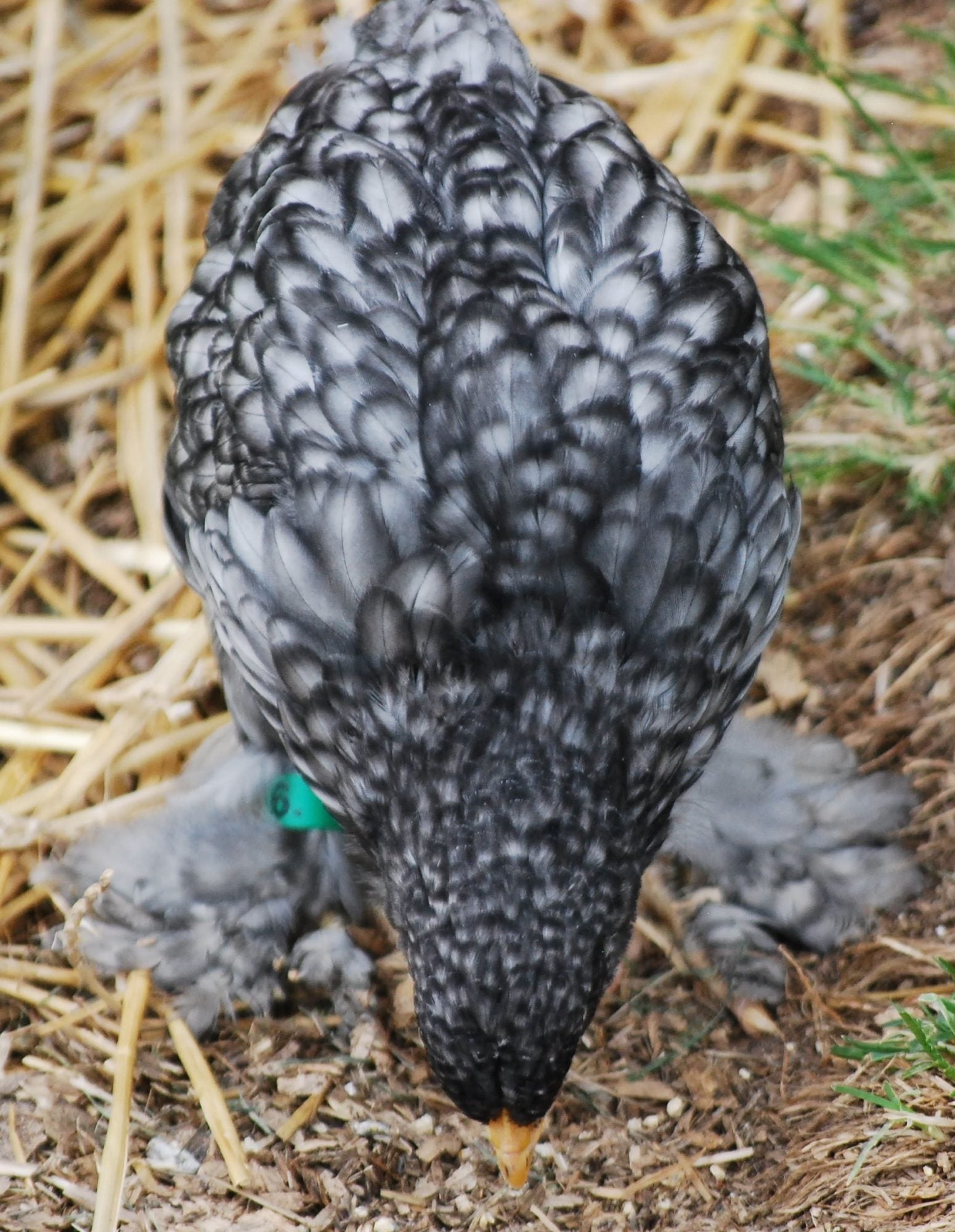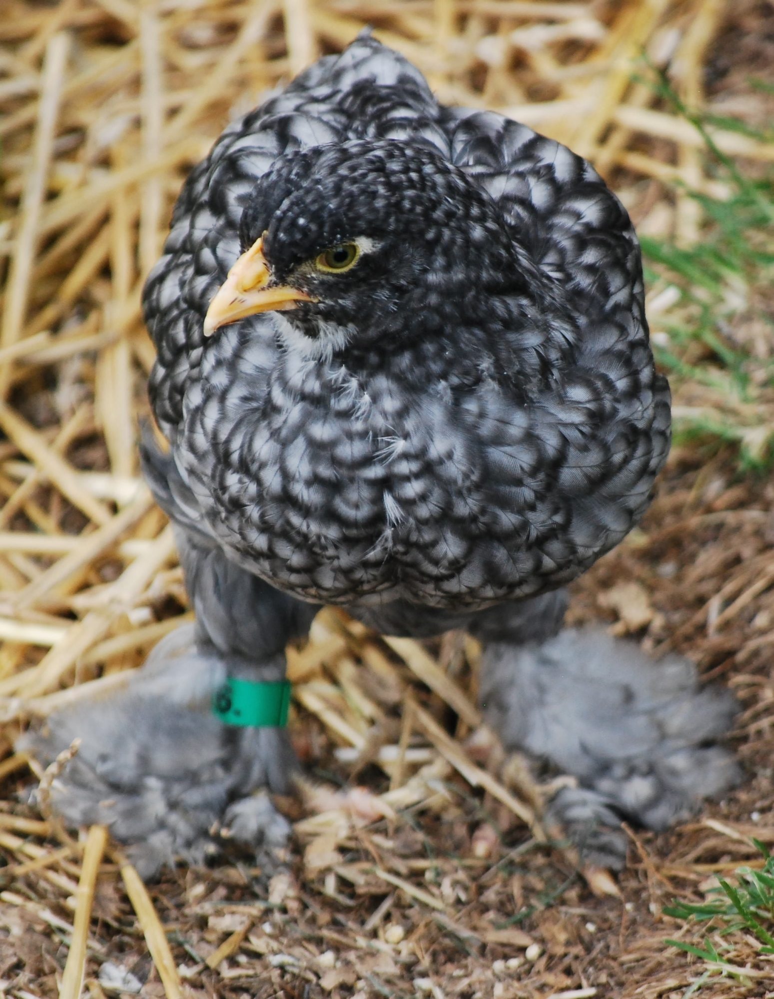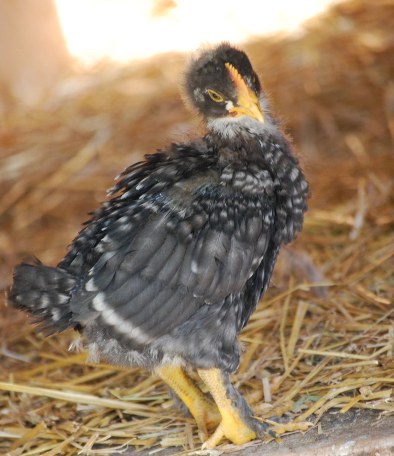 New line chicks at 5 weeks old. It appears with my birds that the barring is less defined. Nice, broad heads & leg feathering on the pullets.