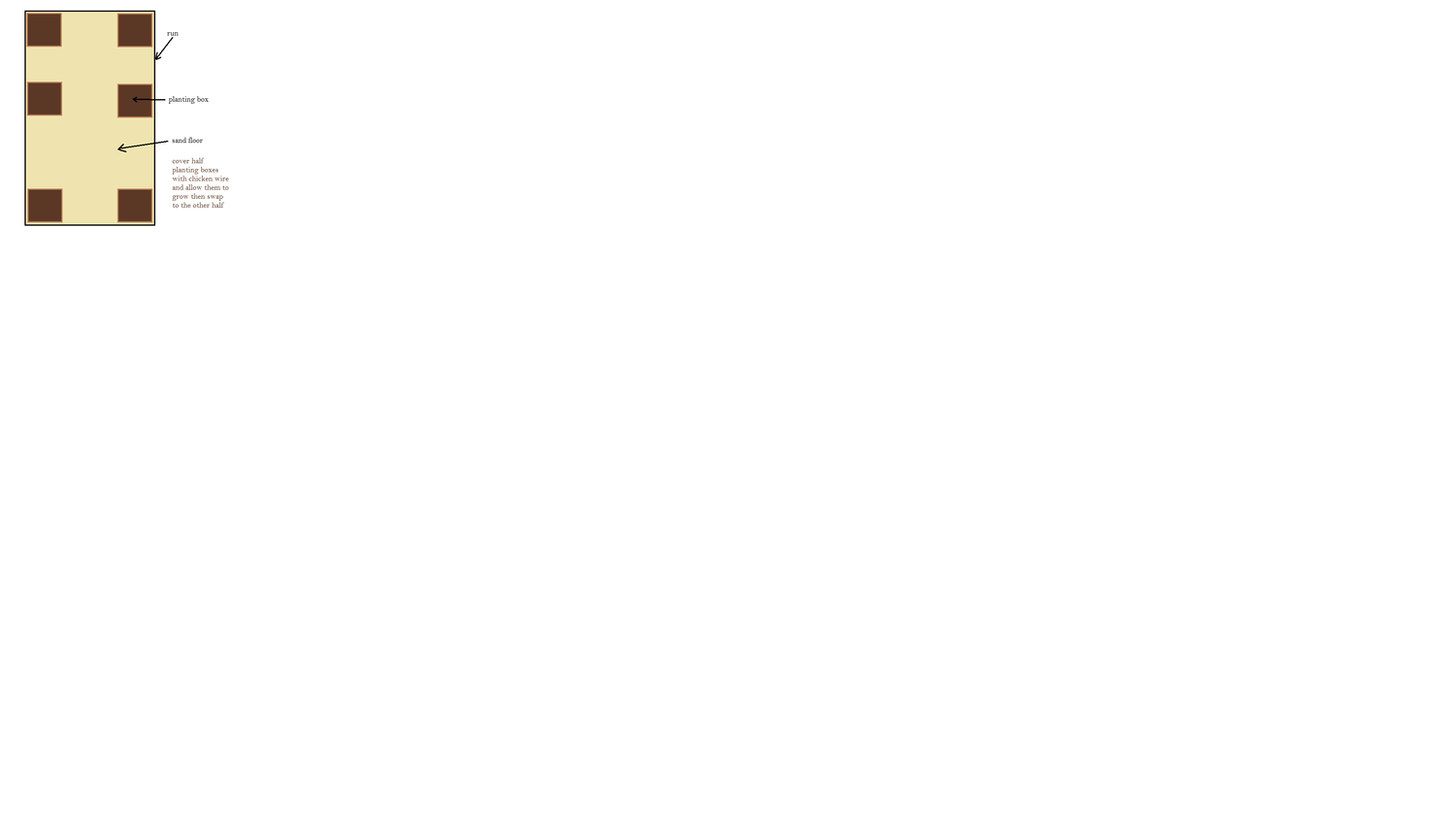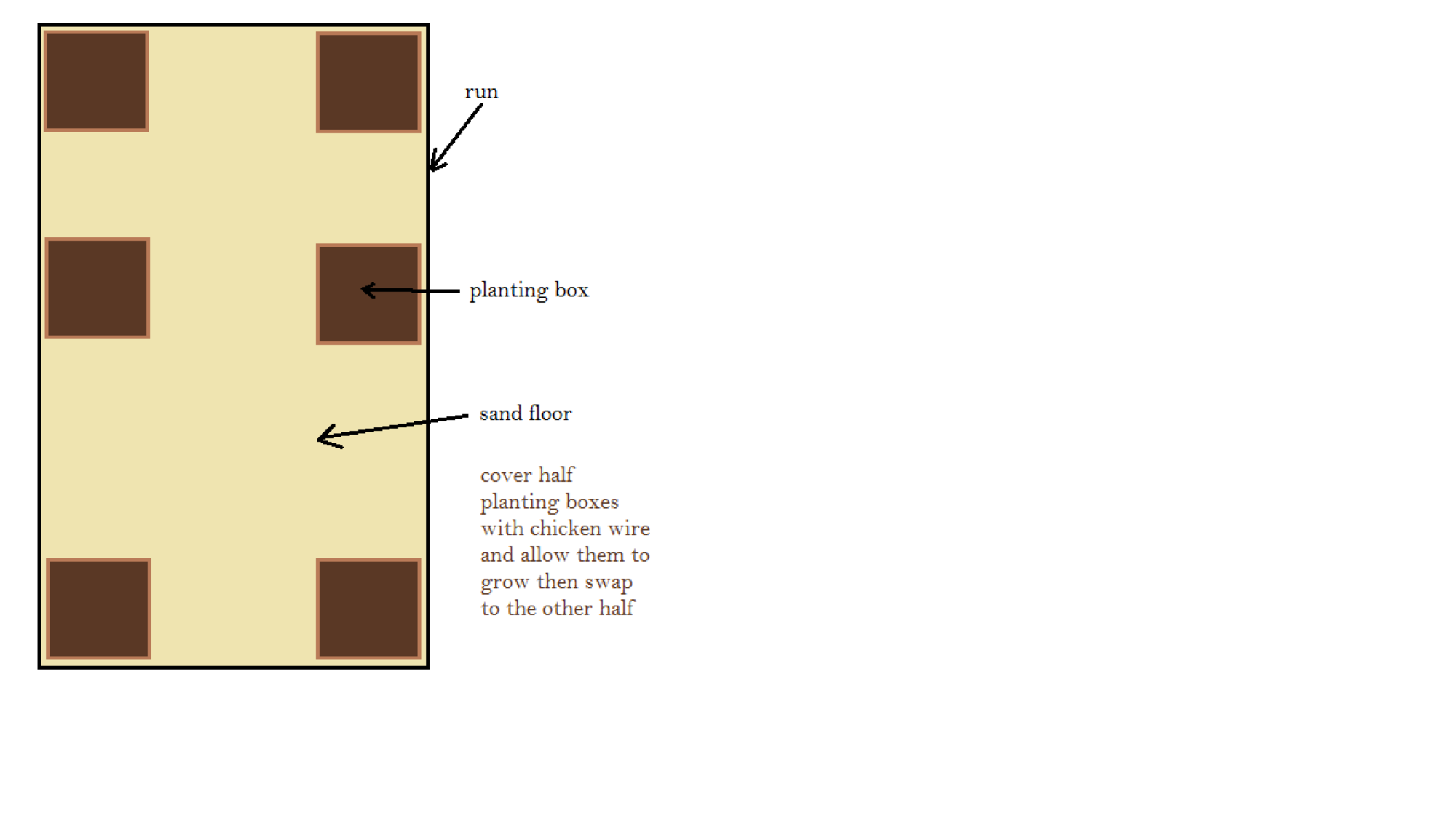 You asked before about using sand but wanted them to have access to grass, worms, bugs, etc. You could make boxes in your run and plant them. Sort of like a raised bed garden. In the walk ways put sand. You can even put some chicken wire around one of the boxes and let it grow up then give them access to that one and do a different box.