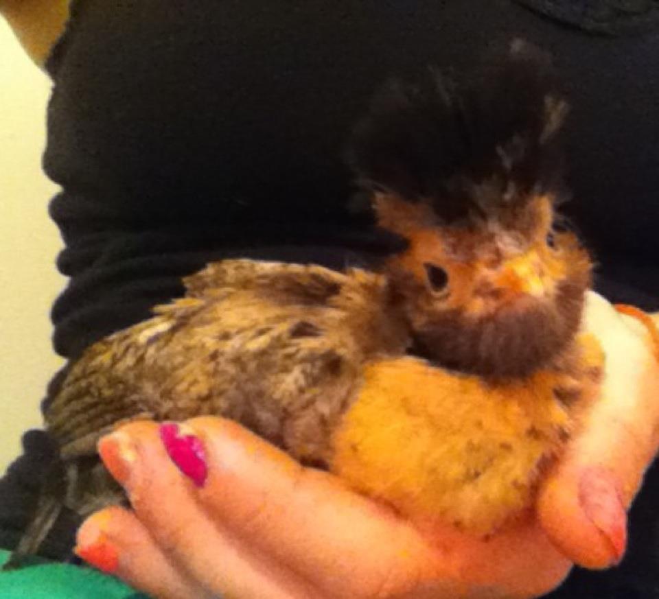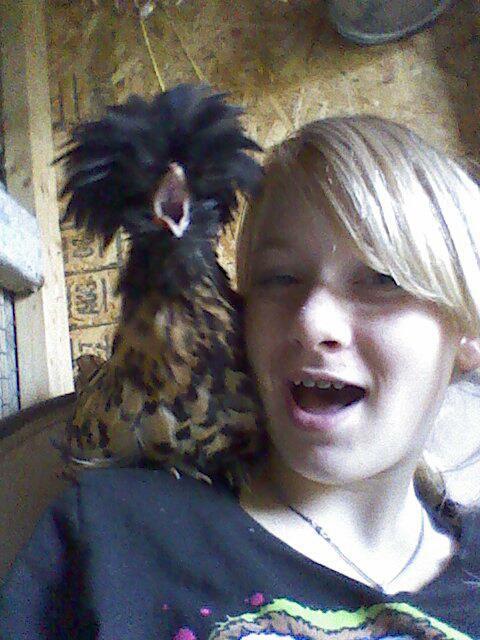 Mufasina and me, We love to cuddle. My mom thinks its weird on how smart she is for a chicken. Comes by her name and LOVE, LOVE, LOVES to be in my warm jacket. She is 8 months old. And is a Golden Polish Crested