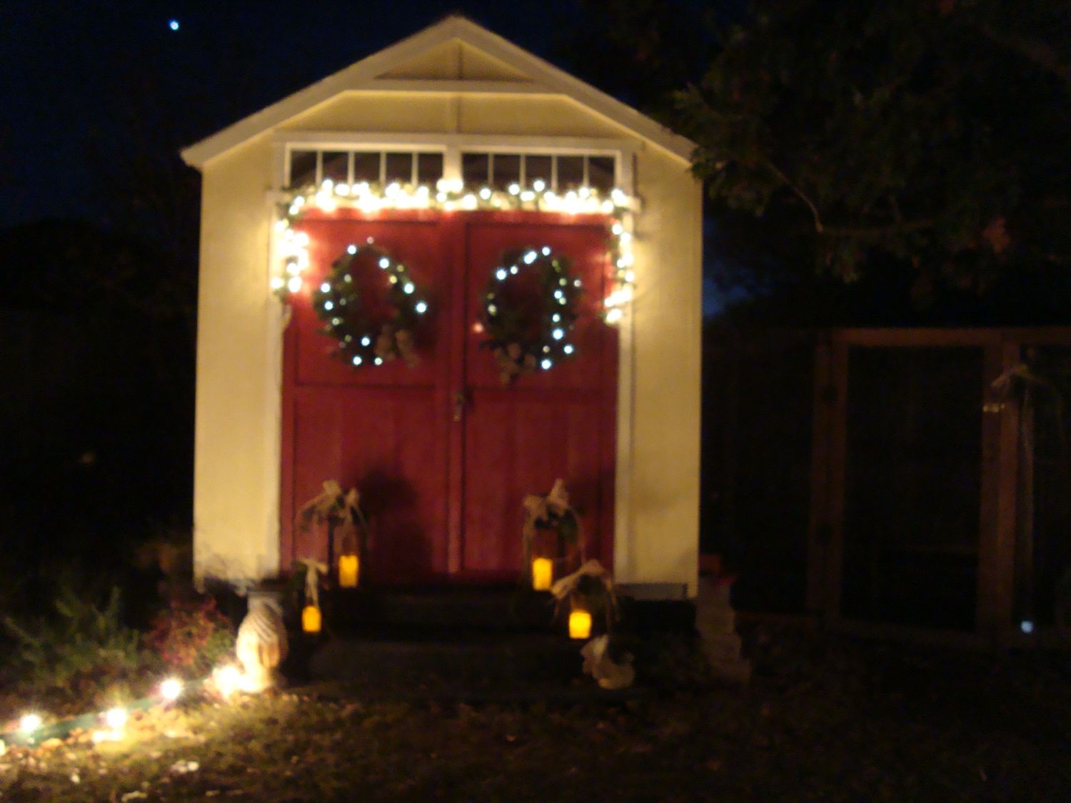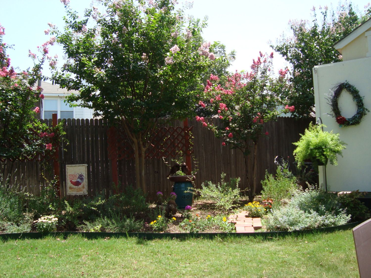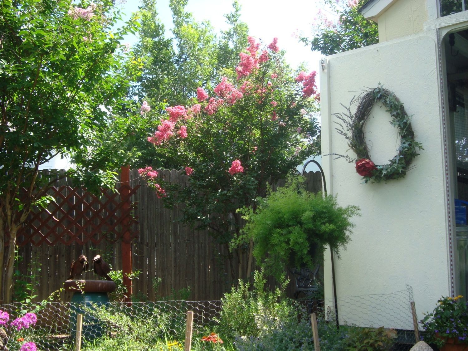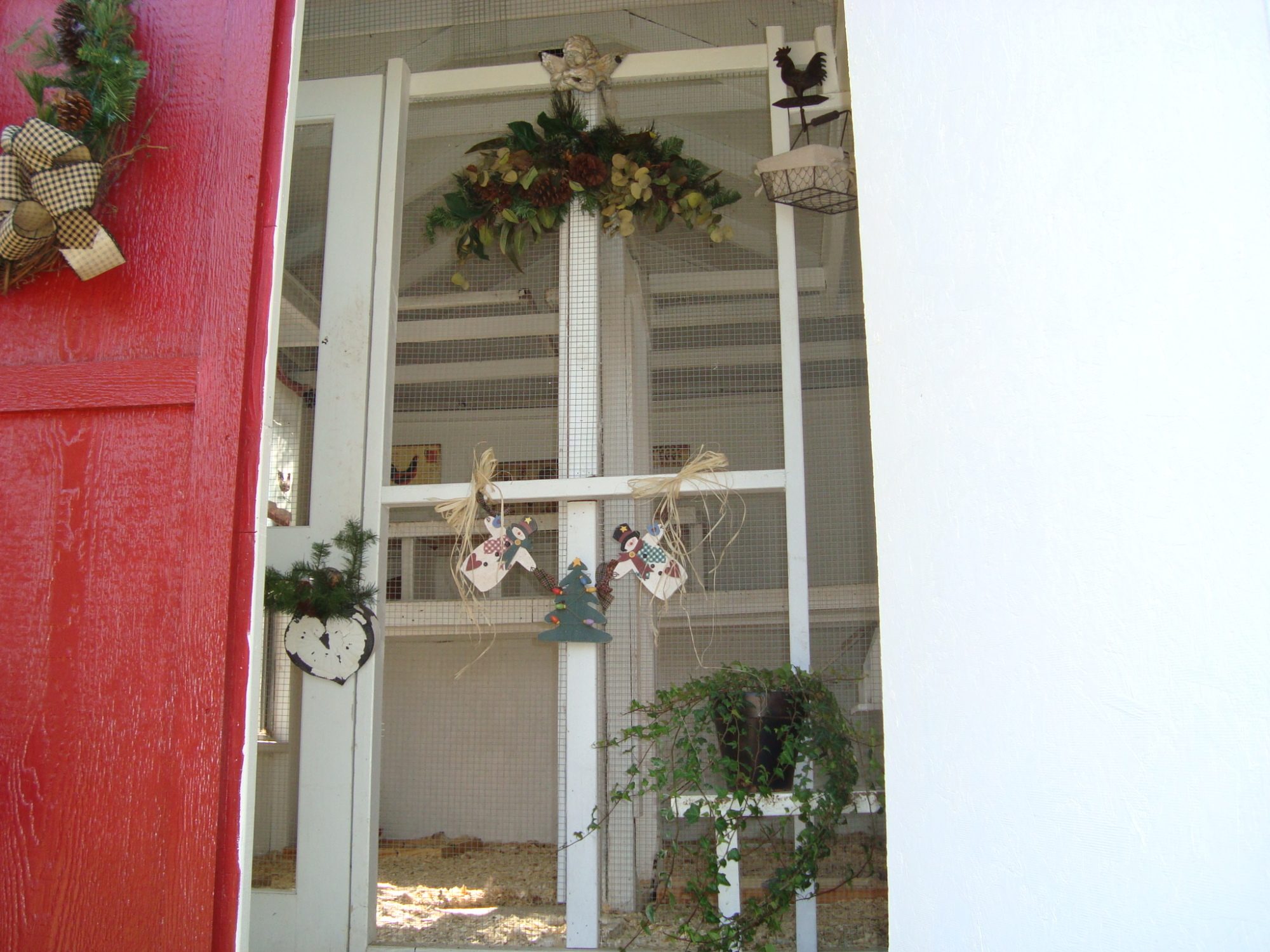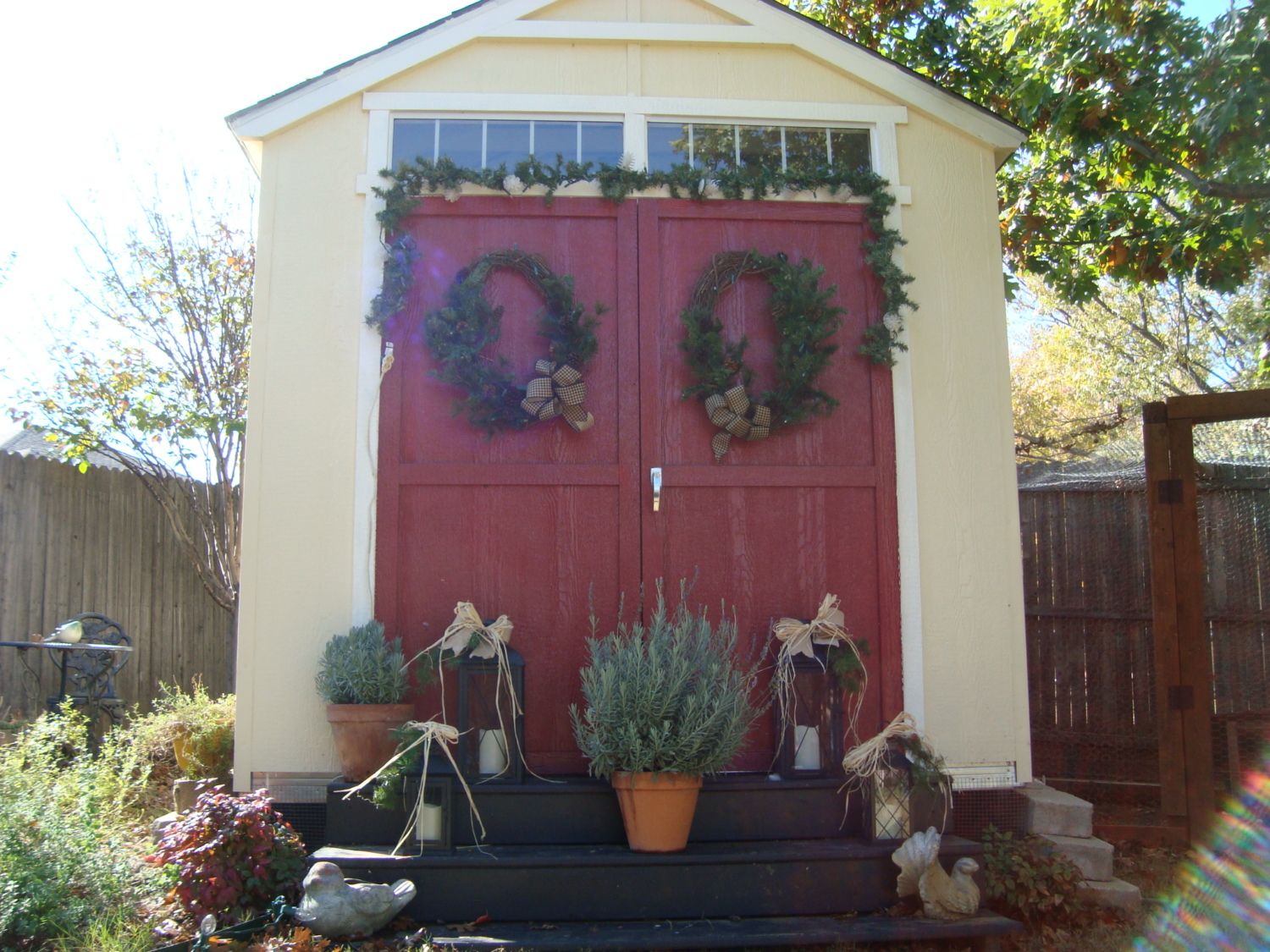 -seasonal wreath, statuary, and lots of perennial flowers next to the coop! Catmint, rosemary, and lavender provide a welcoming aroma!