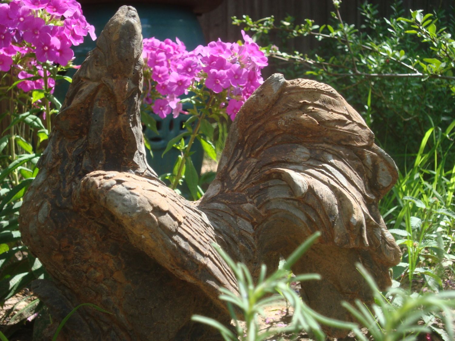 -rooster statuary from a local nursery is cheerful in the perennial bed next to the coop!