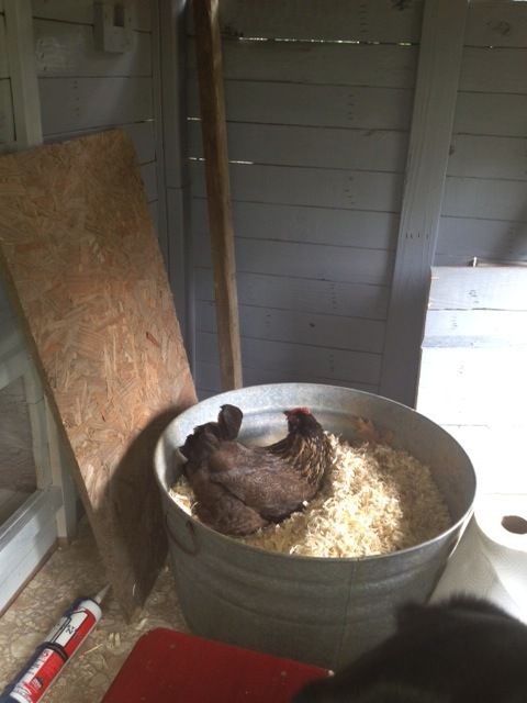 While I was working several of the chickens kept flying up in the windows....they were VERY curious to see the inside of the new coop. I have a washtub inside full of bedding and Welly the EE kept getting in and scratching around the bedding. I took a break and went inside for lunch...when I came back there were TWO eggs in the washtub, lol. I guess they are telling me to hurry up and open up the new coop for business.