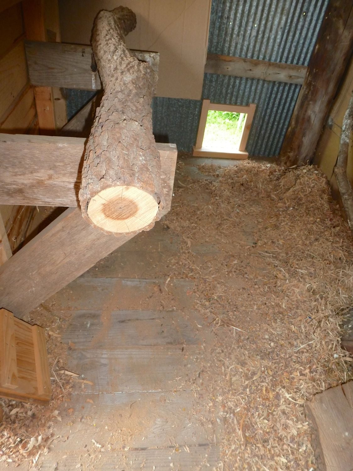 My roosts, made of logs from a hedge tree I cut down (old picture, the ramp was only that steep for a day or two):
