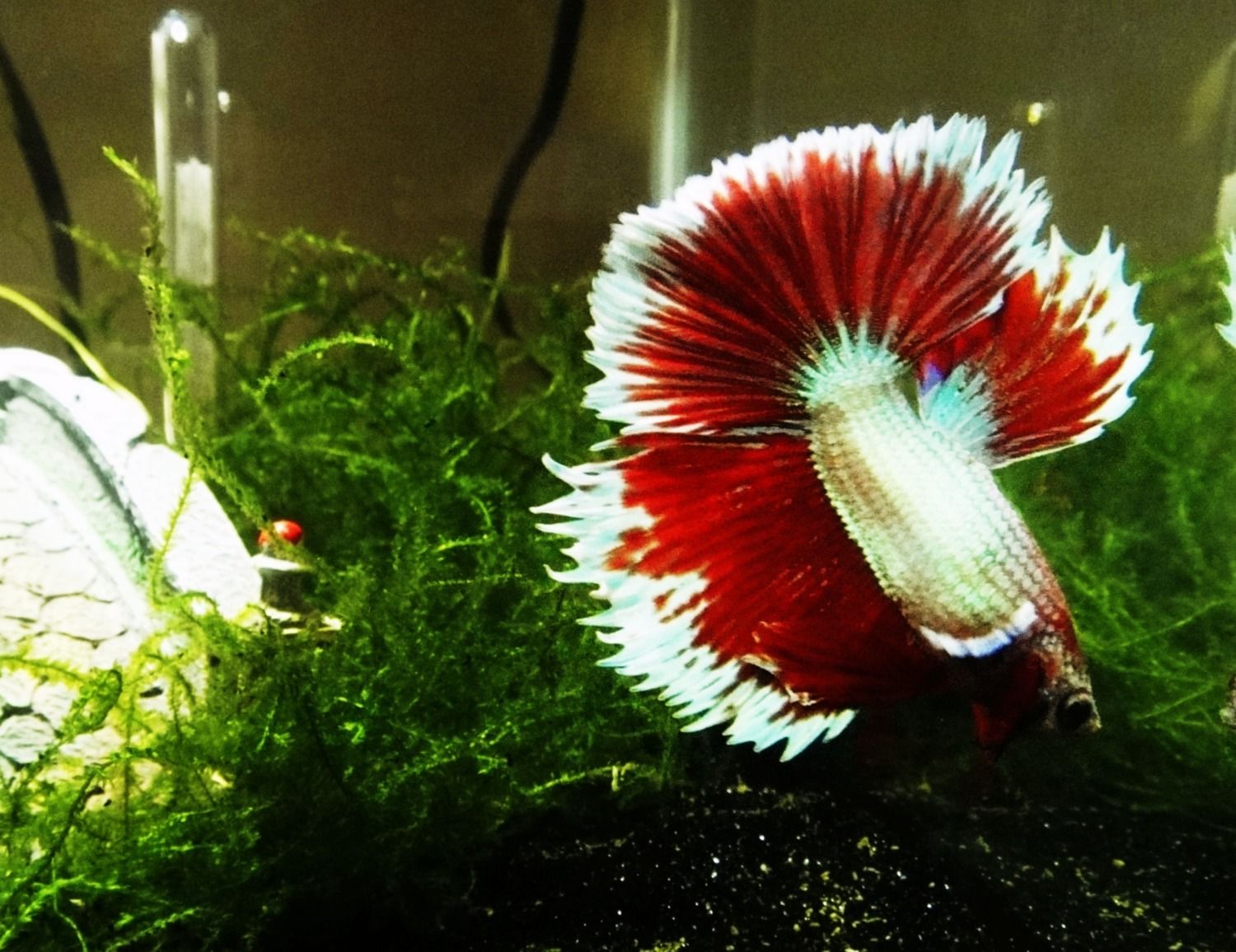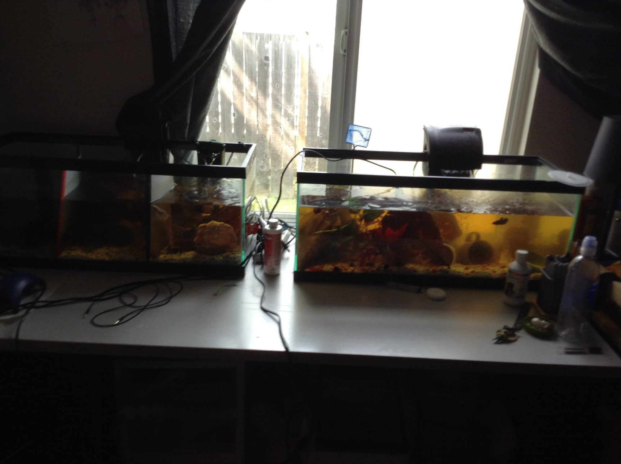 I keep my bettas in heated and filtered aquariums, as they are active tropical fish. I have three males- Blueberry (Lav Elaphant Ear), Google (HMDbT), and Shota-chan (Marbe Dlta) in a dvided 20 gallon long awuari kept at 84° (the best temp for bettas). I also have a betta sorority filled with female bettas who live together (they're also in a 20 long right now, but they're moving to a 40 in a couple weeks. There are about six adult females, as well as all the juveniles from my last spawn. The males will need to be separated soon, into cups with drip filtration, but I'll be leaving the female juveniles in with the adults until they are able to go to good homes, with heated and filtered aquariums.