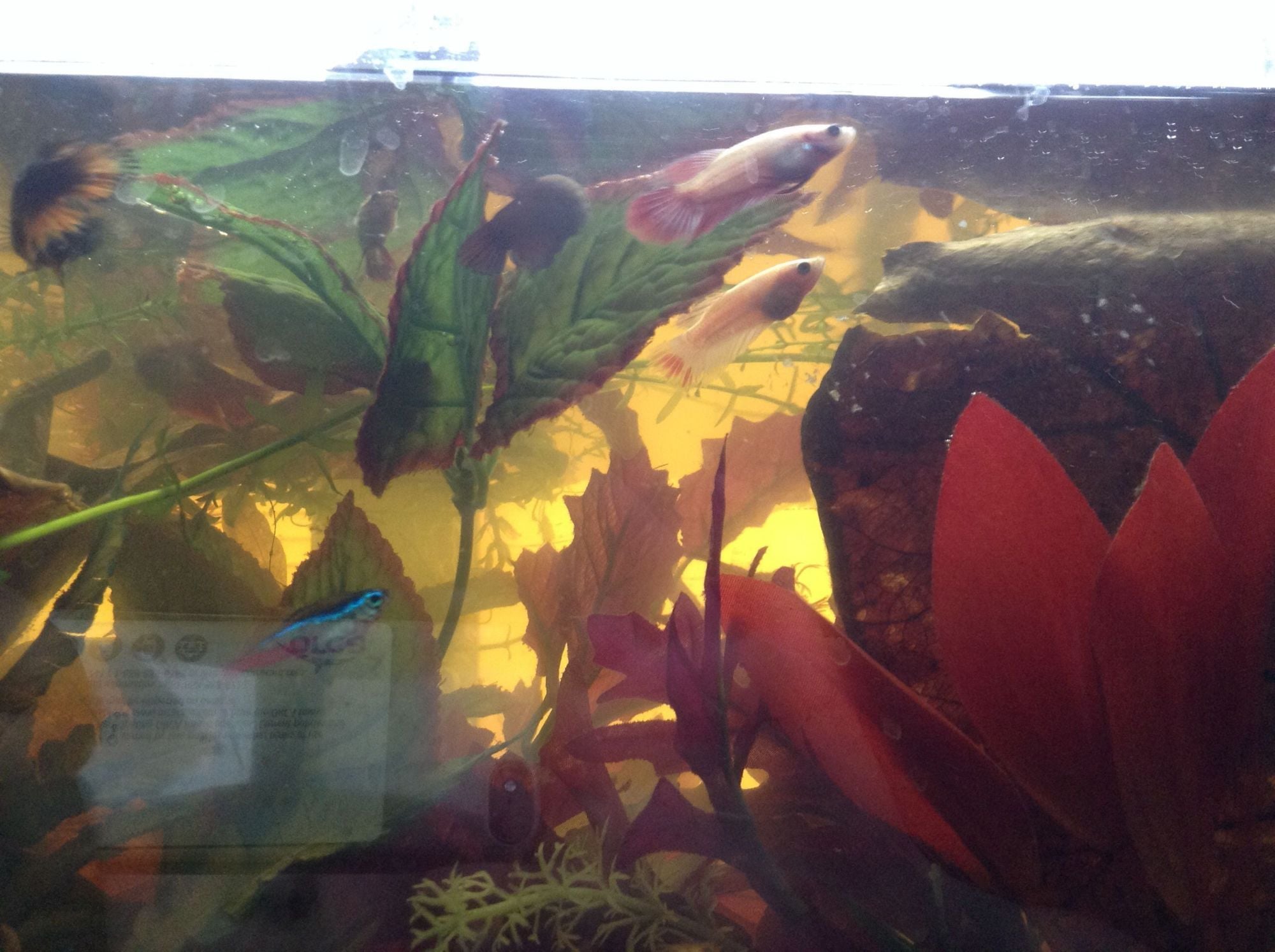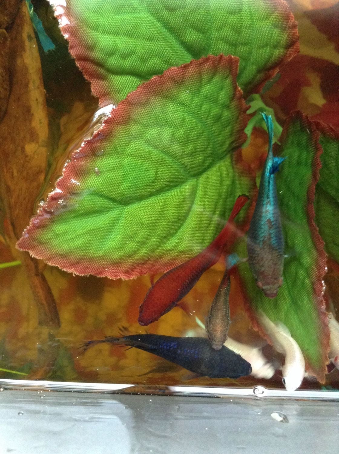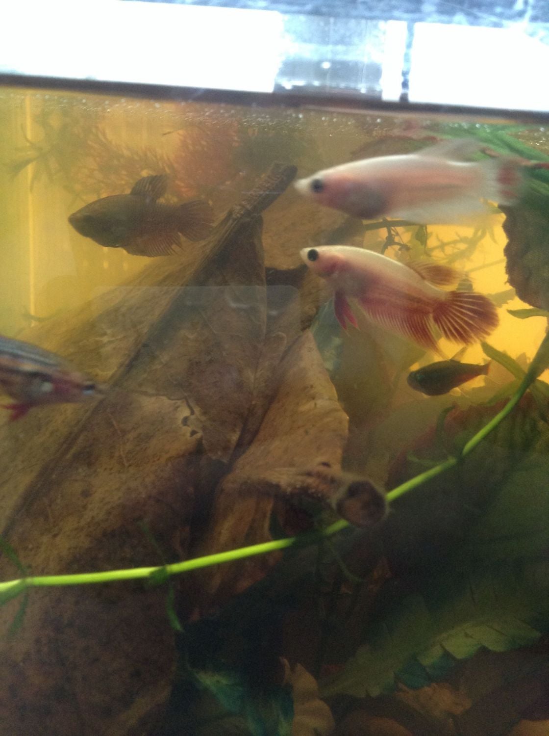 Water is brown due to tannins released from Indian Almond Leaves. Bettas need soft water and my fish thrive when there are IAL in with them. You may also see a few neons, which are the only three I have that survived QT. I will be getting more once my QT is empty again. I am also planning on getting a large school of Otocinclus affinis as they are very cute.