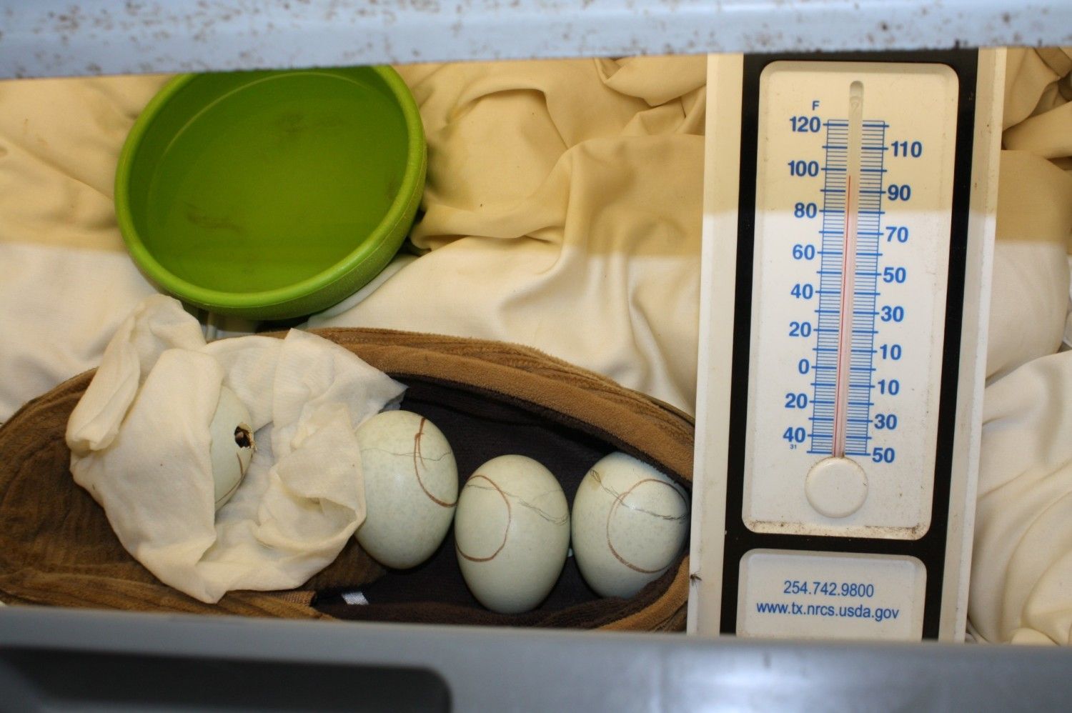 Pics and some advice needed. Okay, so there was no real way to control humidity in "incubator", so I put a piece of foil over the water bowl and extended it over the eggs and the bulb of the thermometer. I was not sure if that would work (but it did) so when we saw the external pip, I removed a bit more shell so I could see if the chick was shrink-wrapped. (I also wanted to make sure the beak was visible...that it had not had trouble getting through the inner membrane.) It looks fine and moist in there, so I've covered it all back and am just giving it more time. Questions: