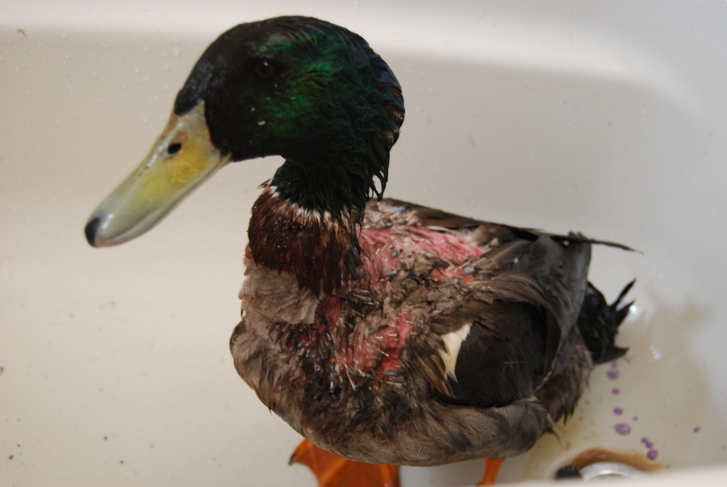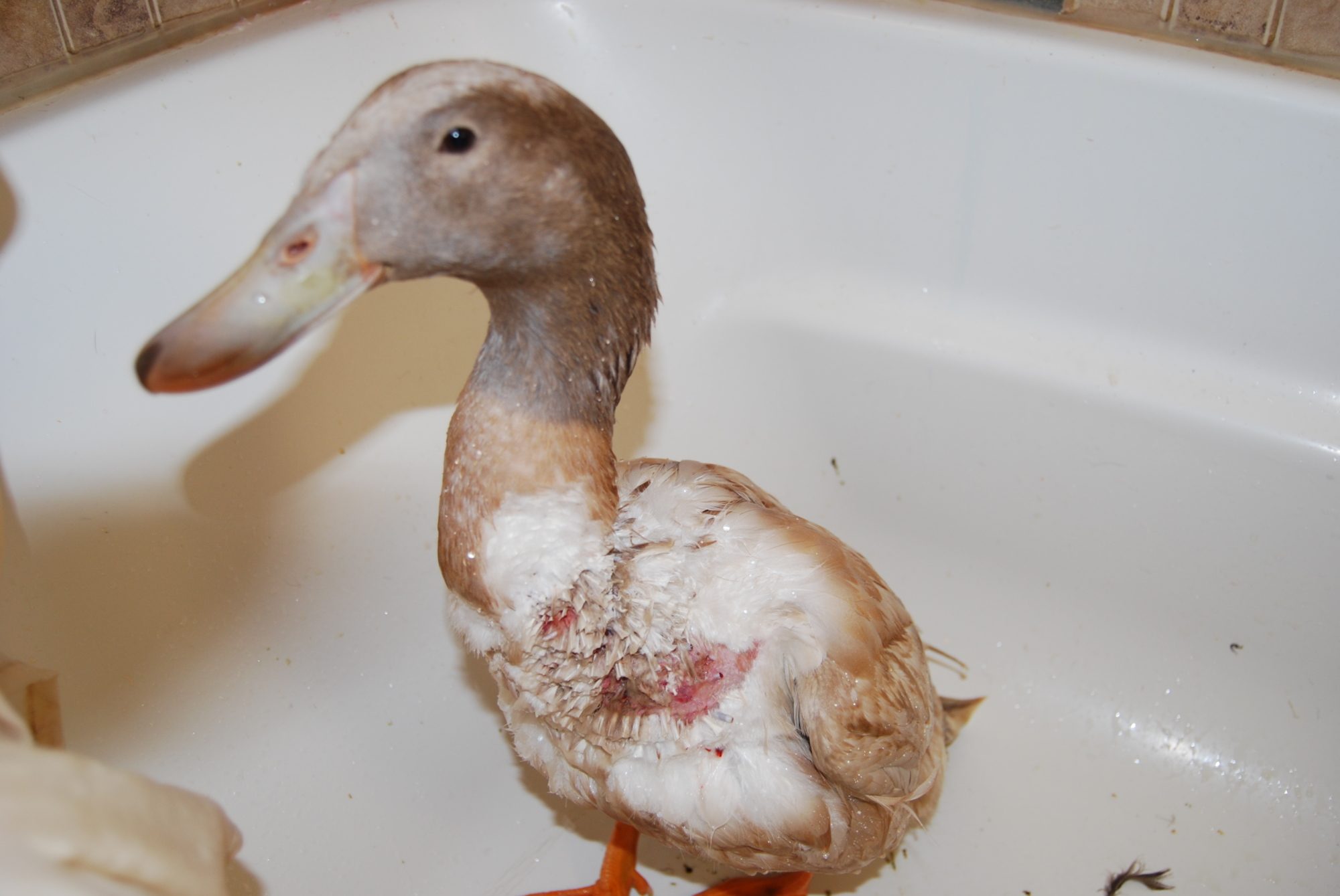 However, my male Ruen, Sarge, is lethargic. He is inside on cage rest and will not stay out of his water bowl, He drools a lot when he drinks, and is not eating very much. My concern is that he may be fevered, or have internal injuries. How can I tell? And how do u treat a fever in a duck?