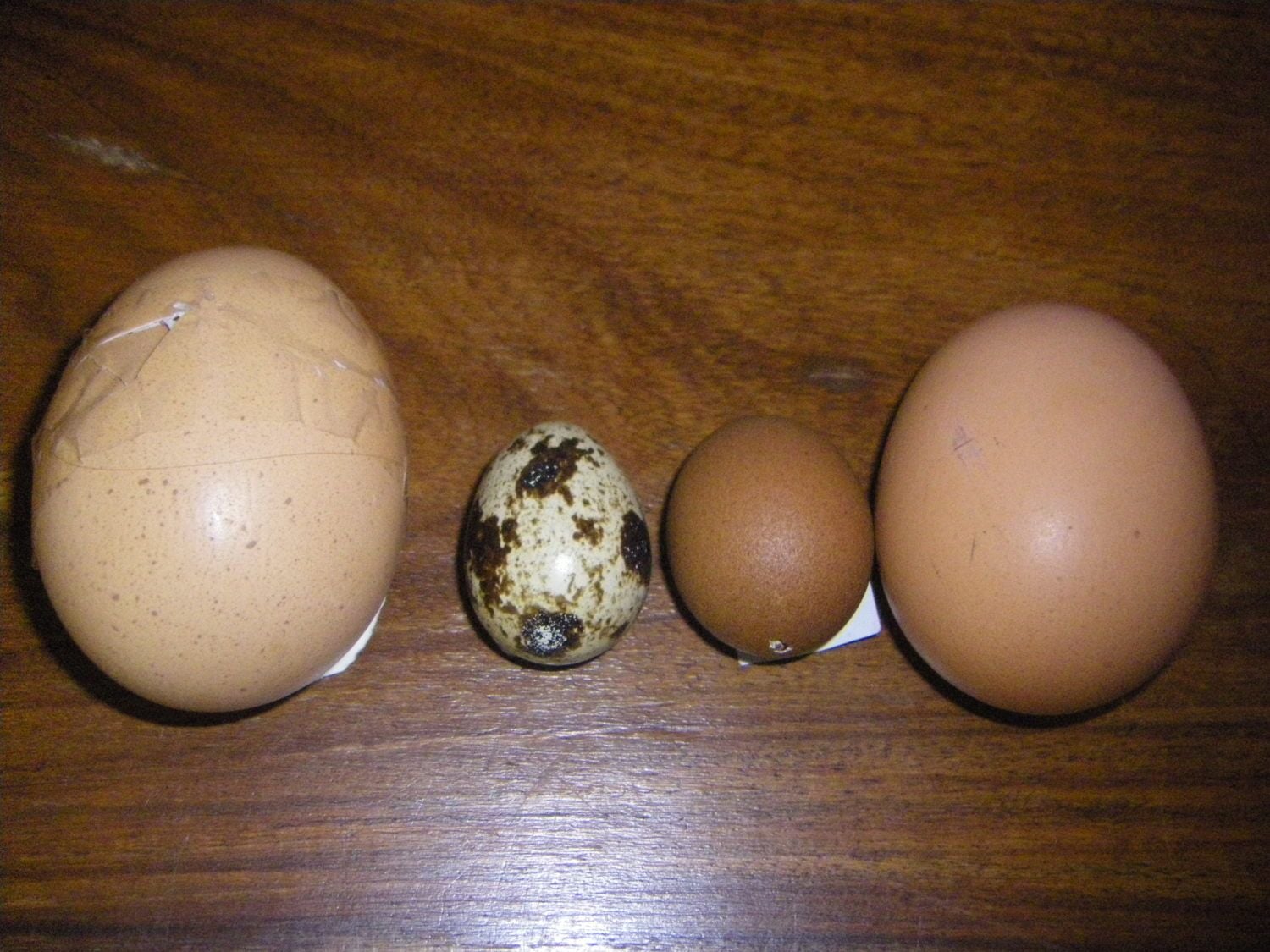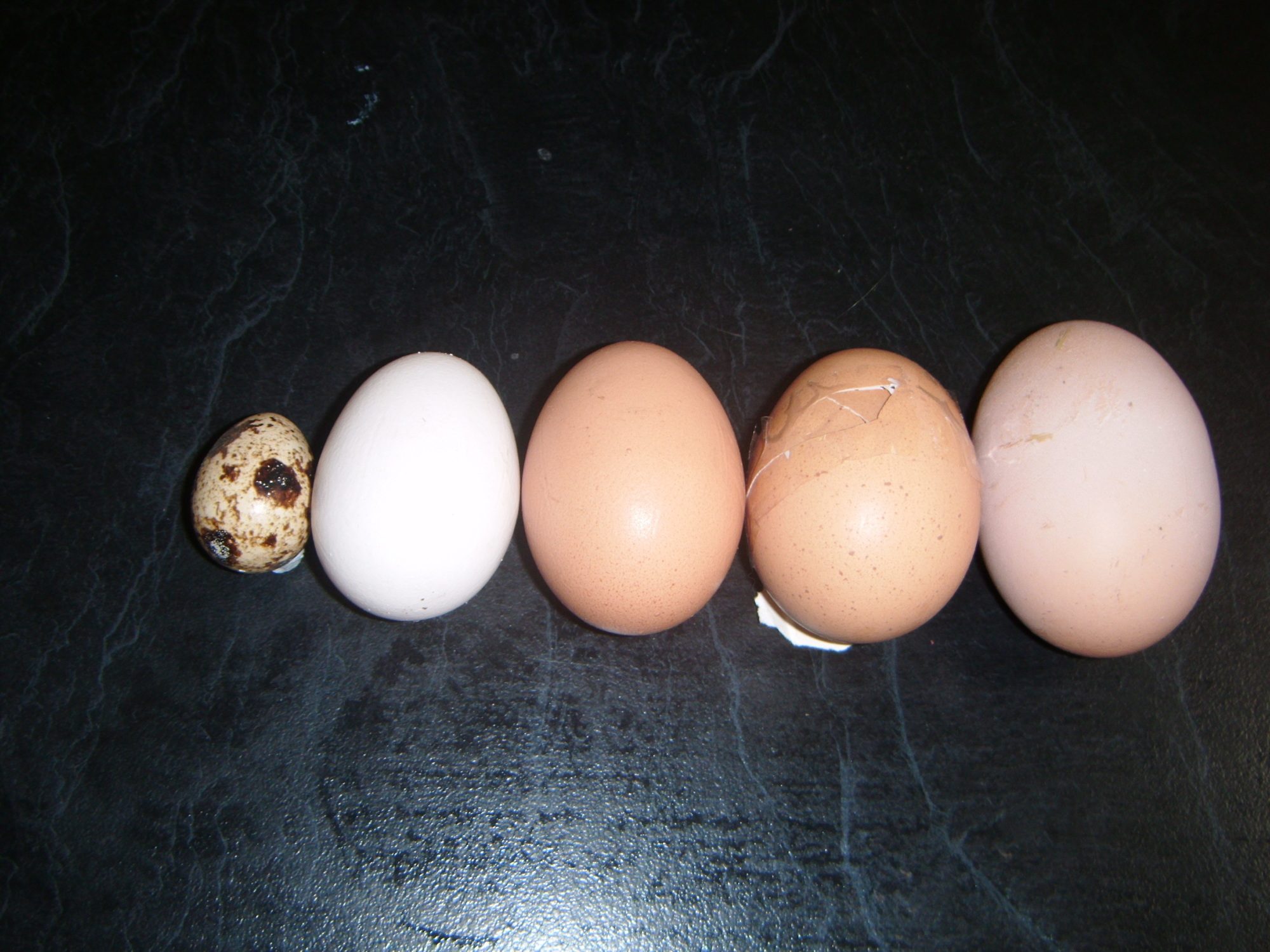 From left to right- Quail, Bantam, Average, Double yolka (previouse largest egg), Mega Egg.