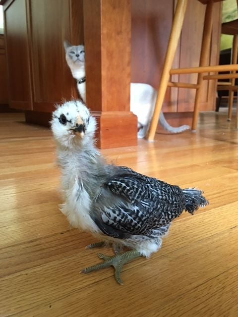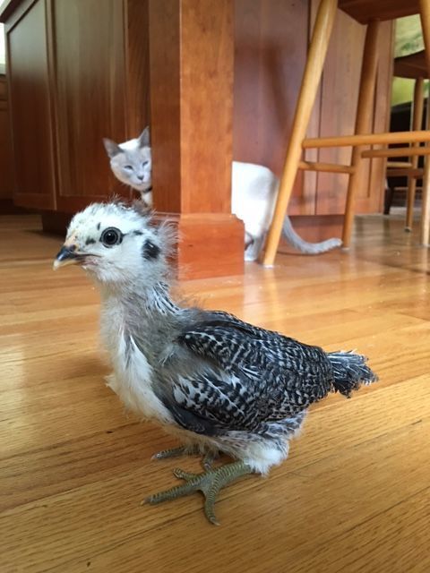 I am hoping that someone with personal experience can chime in here. I do understand that black and white easter eggers are often male, although not always. Can anyone with personal experience make an educated guess? This baby is 3.25 weeks old. (Excuse the cat photobomb!)