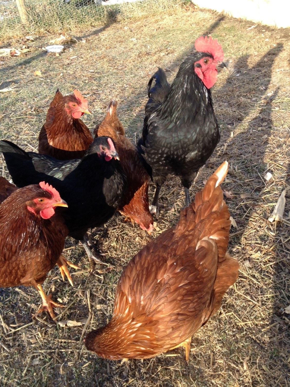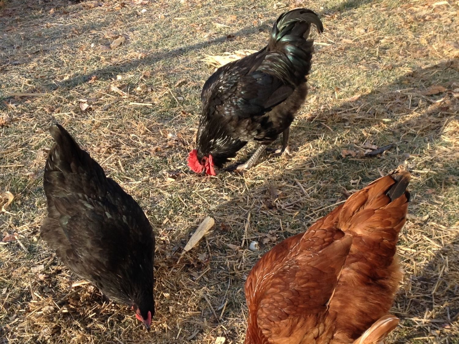 In the first picture the one to the right is a rooster.Well after staying up most of the night reading I believe its a Roo, especially since I found buds where the spurs should go. Here are two more pics though so I can get an official word. Praying he doesn't start crowing, just because I promised neighbors we were only getting girls. I would keep the guy now that I know the eggs are edible. Such a pretty and great tempered thing. I honestly have no idea how old. We got them end of August and they were the size in my profile pic. This is my first ever attempt at chickens and probably did not ask the correct questions even after reading 2 books. I'm so glad I found this forum. I'm learning so much!