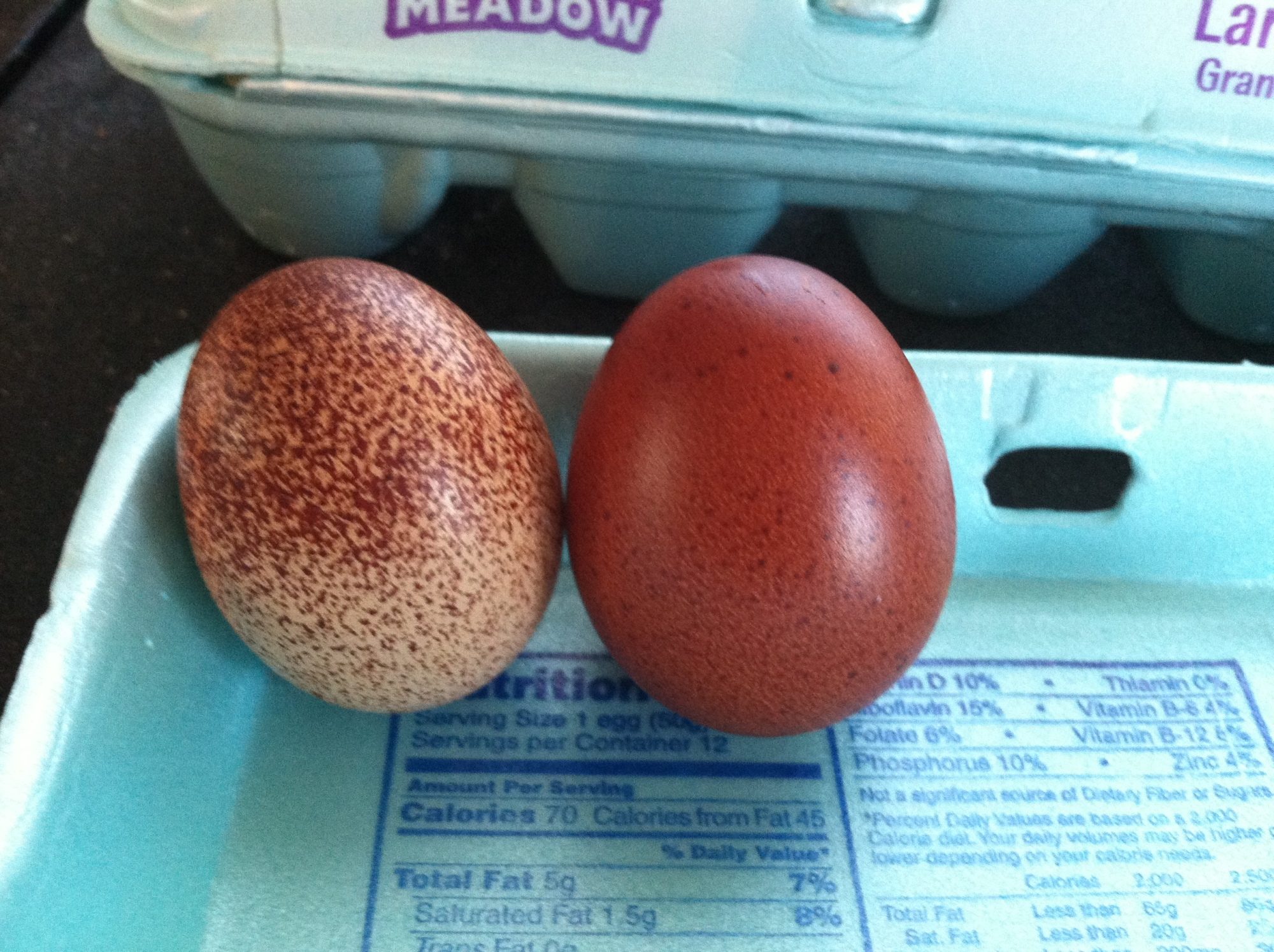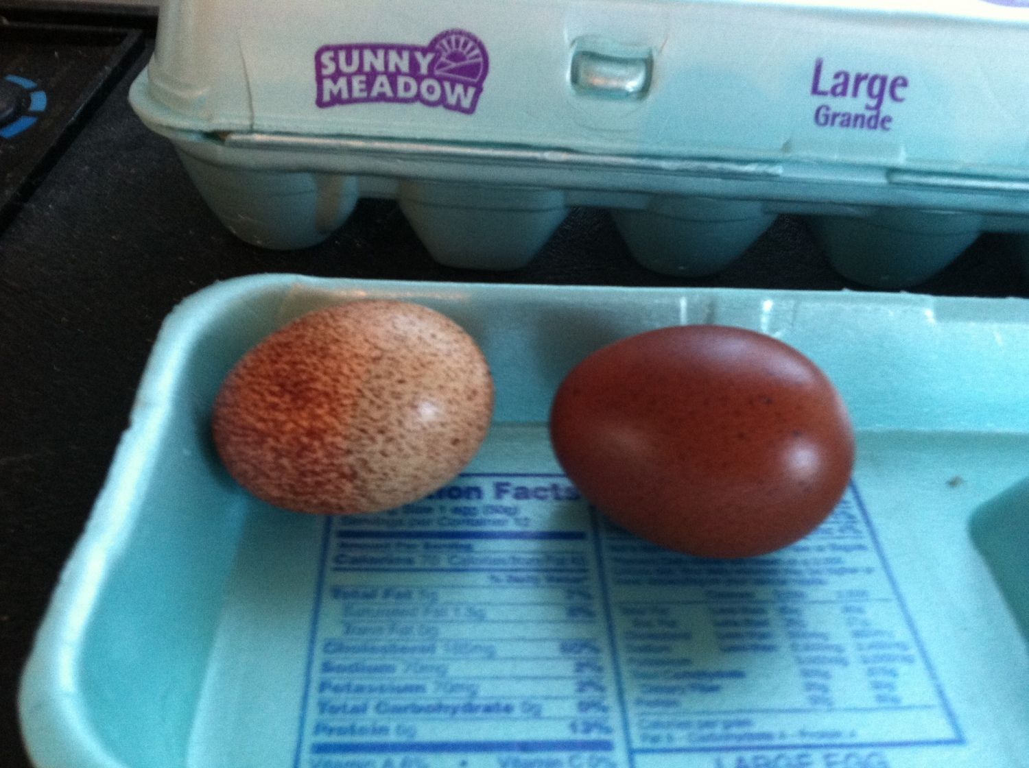 I love this girl! She laid another dark one today like the one on the right and it was bigger by about 1/4". It is almost as big as my LavOrp egg and they have been laying for six months. Is there a thread for blue copper splashes? I couldn't find one when I searched.haha! Okay pictures below. I guess that's what I get for buying hatching eggs from an unproven source...off eBay! I just wanted something dark for my broody to hatch and wasn't carrying about lineage or breed SOP. That will teach me. Looks like they might be Copper Splashes and who knows what else. They were advertised as 3 Blue Splash Maran eggs for hatching from Silverfire08 on eBay. Here's the 25 week old rooster, Rusty.And his hatchmate, Bunny, pullet