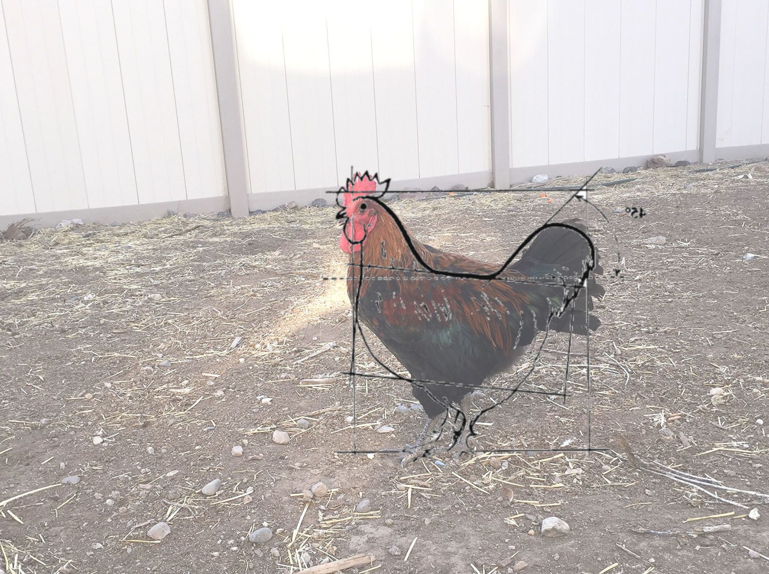 He has feathered shanks, but the RSLs picked them off when he was younger. I hope he get's them back with a molt or adult feathering. Faults: eye color is not quite light enough, but could still grow into it. Comb has the slight S curve in the front. Chest has some color to it with barring in the breast feathers. Hoping his breast and backside fill in a bit.