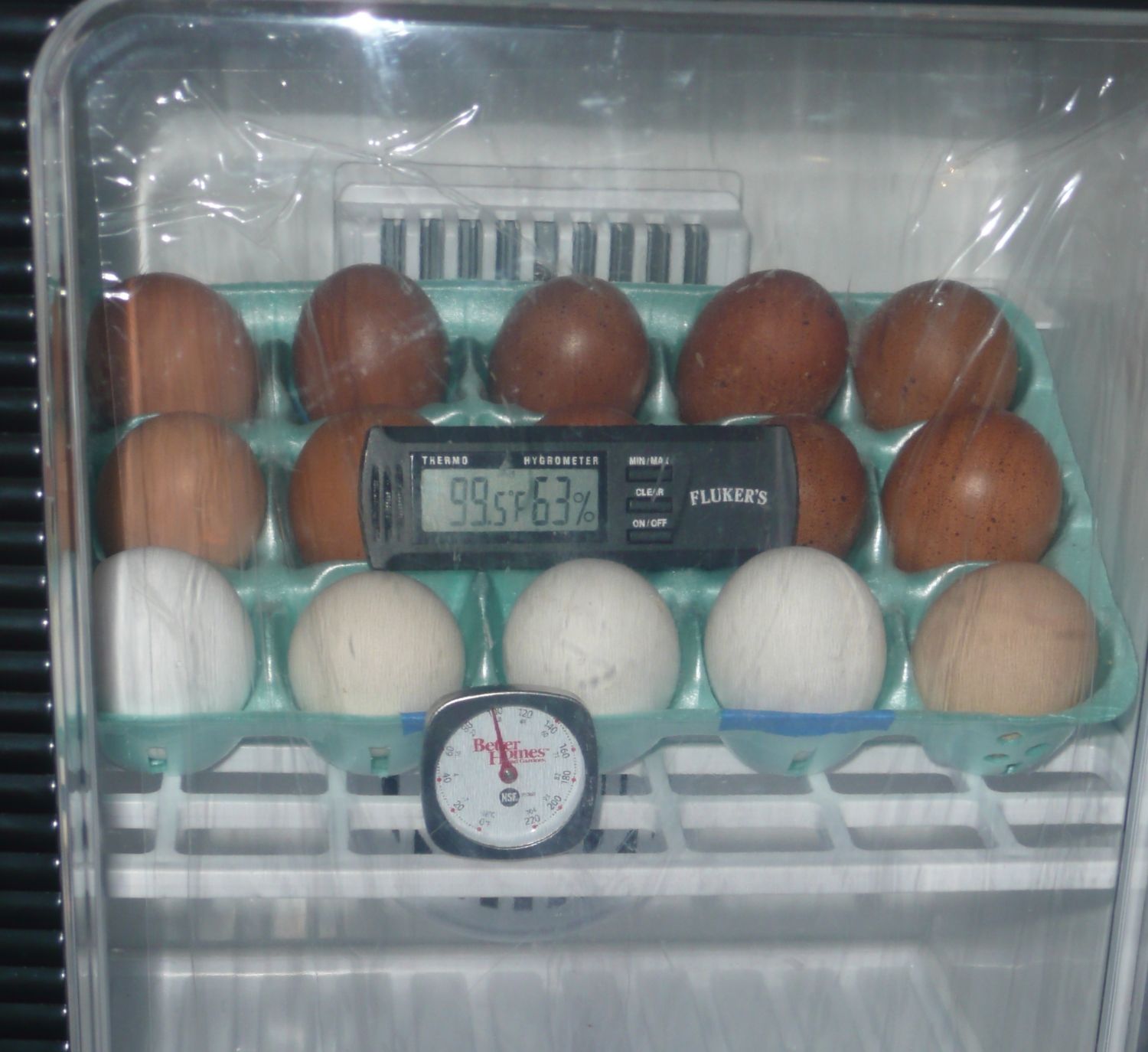 The Marans mix hatched from on the of the eggs on the back two rows. The breeder told us she didn't think it was possible for the father to be a white leghorn, but she had not idea what could have come out dominate white from those eggs and she did have white leghorns on the property and things do happen.