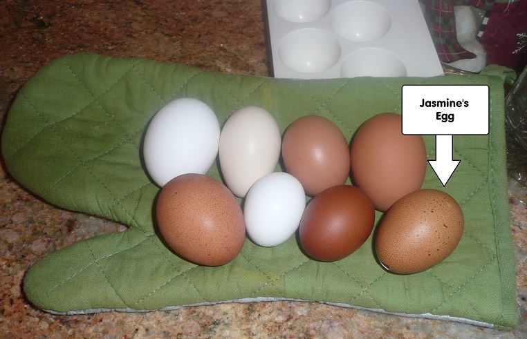 Her egg color was typically like the egg labeled Jasmine below. Jasmine was out first BCM hen. She never laid darker than a #5 and her eggs faded to a #3 at the end of the laying cycle. Some days our Marans mix laid darker eggs than Jasmine did. For comparison in a #6 Marans pullet egg on the front row. The two eggs on the back row are both Marans mixes with white egg laying breeds.