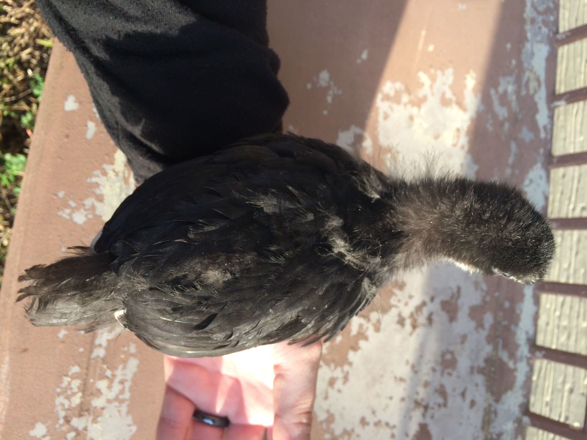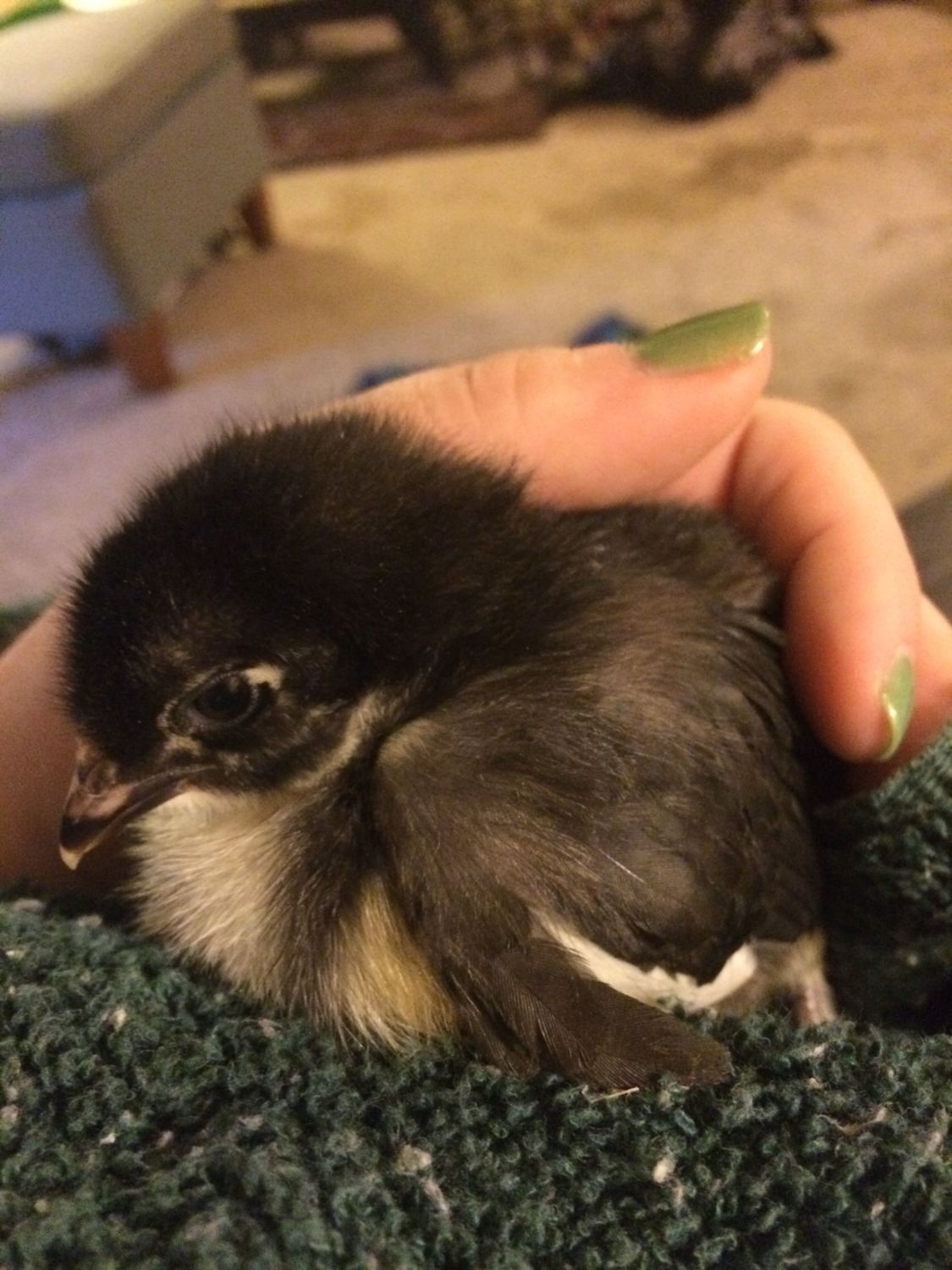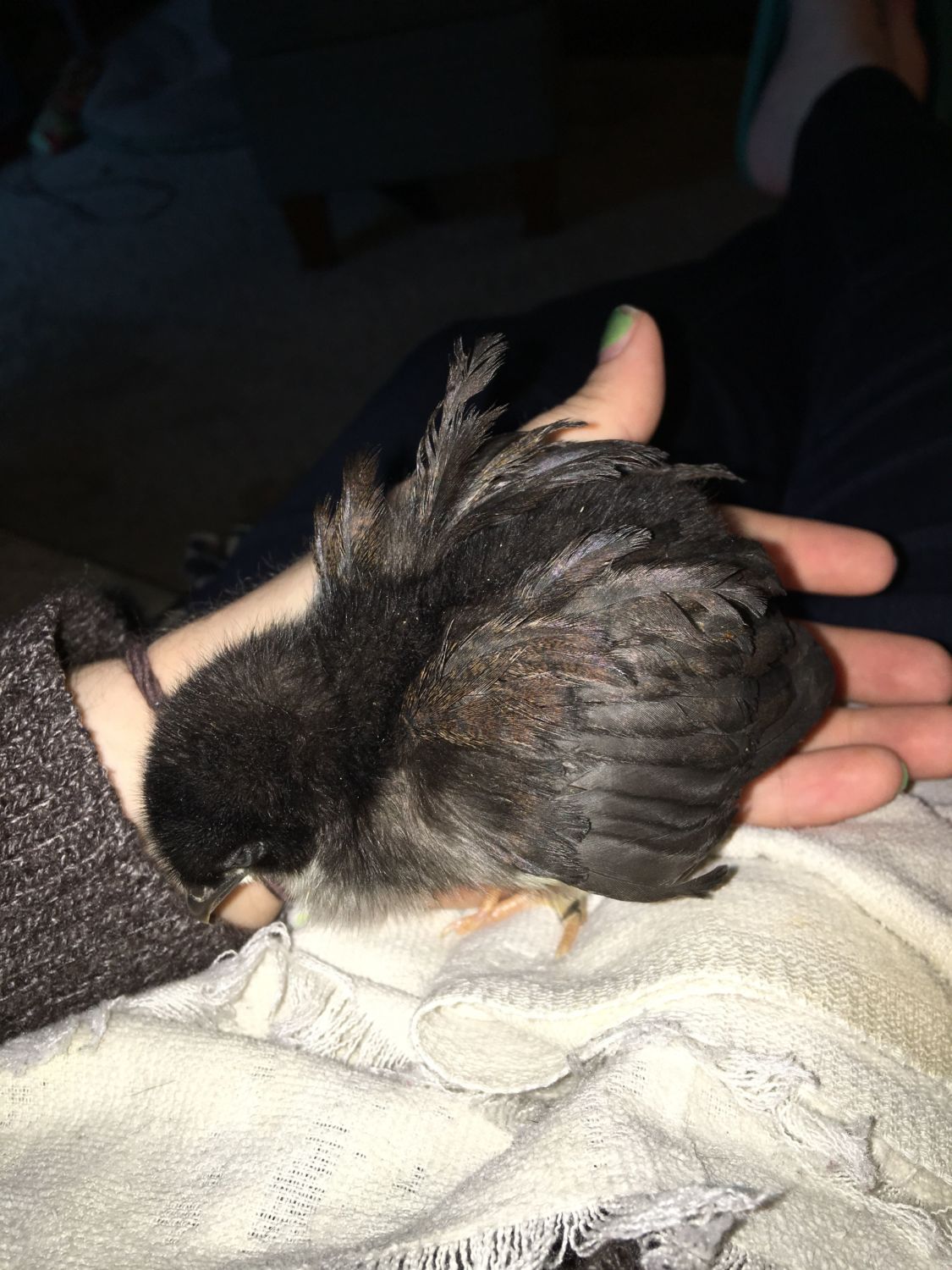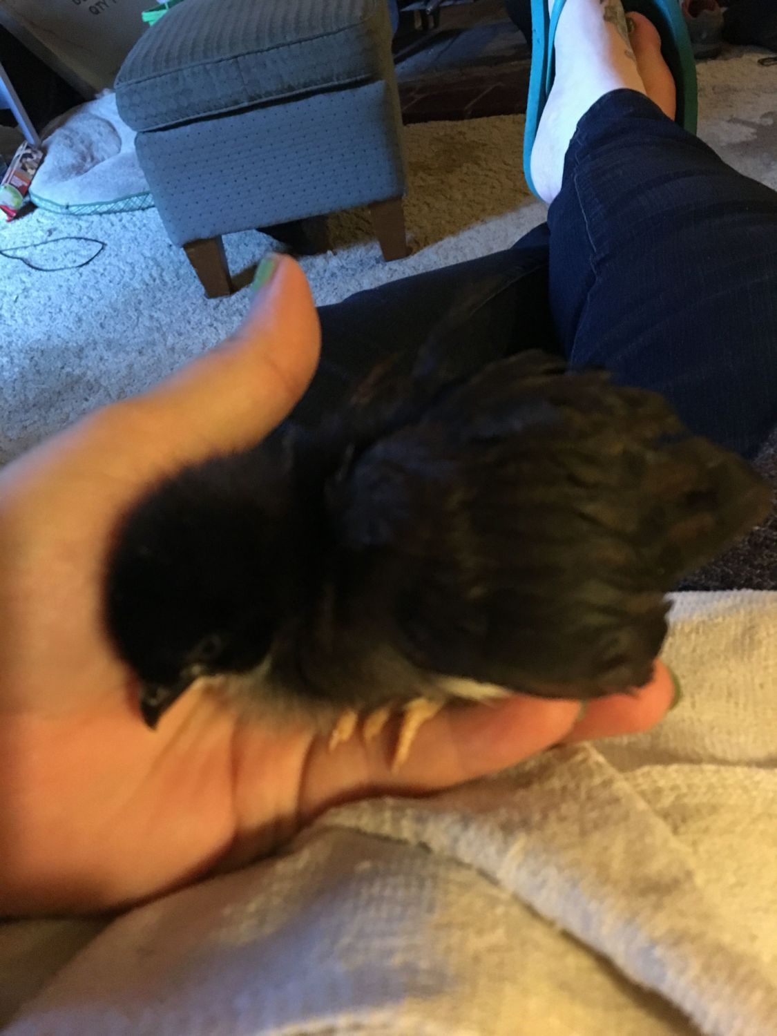 It was just cuddled up to my hand. Normally, it's running around with the other birds. It's in medicated chick feed. When I put down the fresh water & feed, it'll run up with the others & will push its way through to eat. So, it doesn't let its size stop him/her.